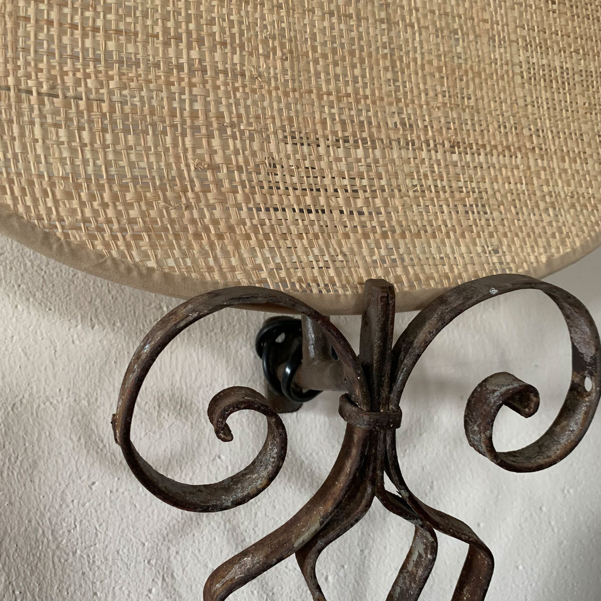 Il n'y a pas de meilleur moyen d'éclairer une pièce que d'utiliser une applique ! À partir d'une gracieuse pièce en fer forgé récupérée sur un balcon au Liban, nous avons conçu cette applique et l'avons associée à un abat-jour en raphia.
