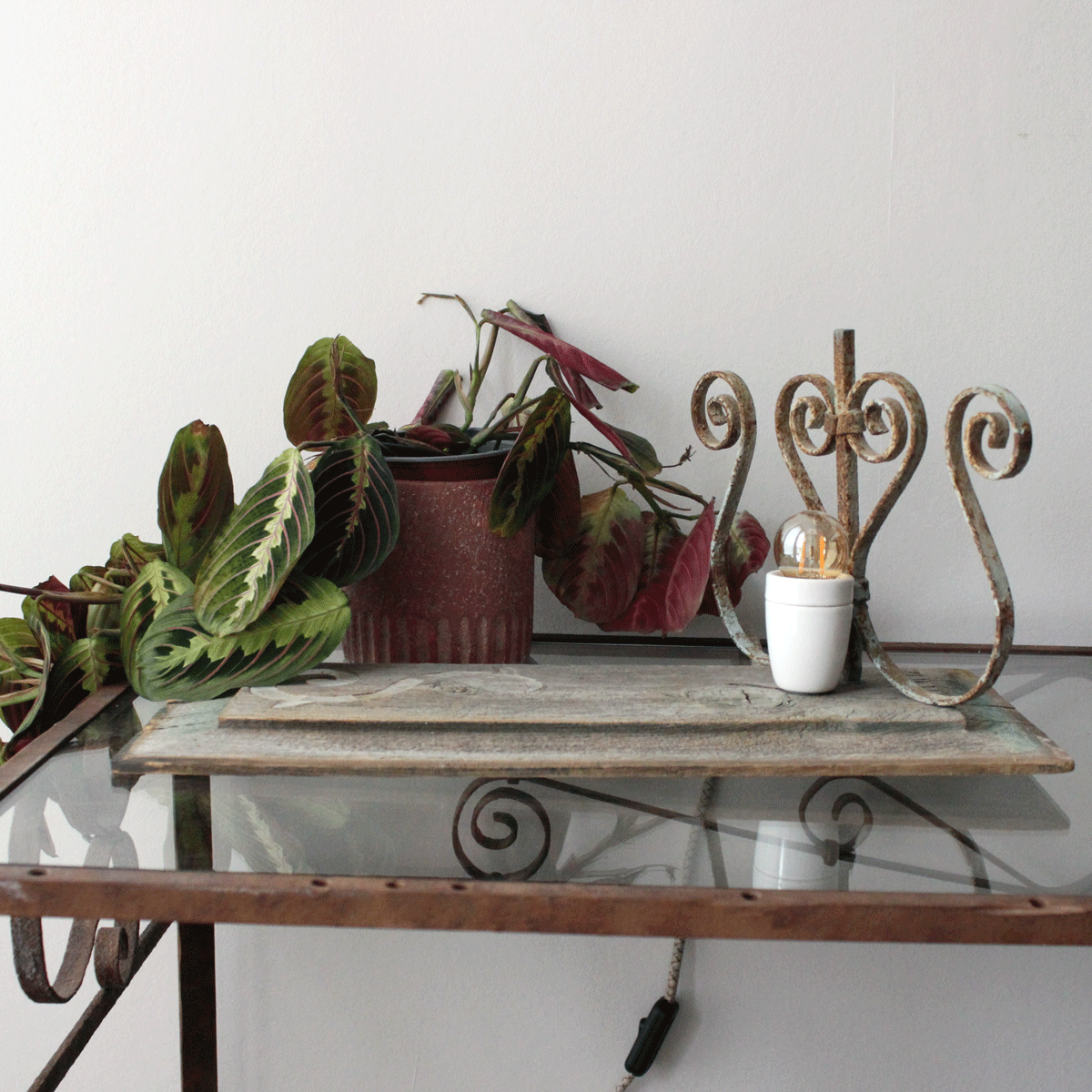 Explore the artistry of three distinct workshops converging to craft captivating pieces for your delight! An old door panel, adorned with gentle shades of tender green, intricately inlaid with a mother-of-pearl curve, forms the centerpiece. Complementing this, an iron element from Syria, boasting similar soft tones, completes the lamp. Behold, a truly unique table lamp, offering ample space for your favorite mug or candle, ready to illuminate and adorn your space with its exquisite charm.