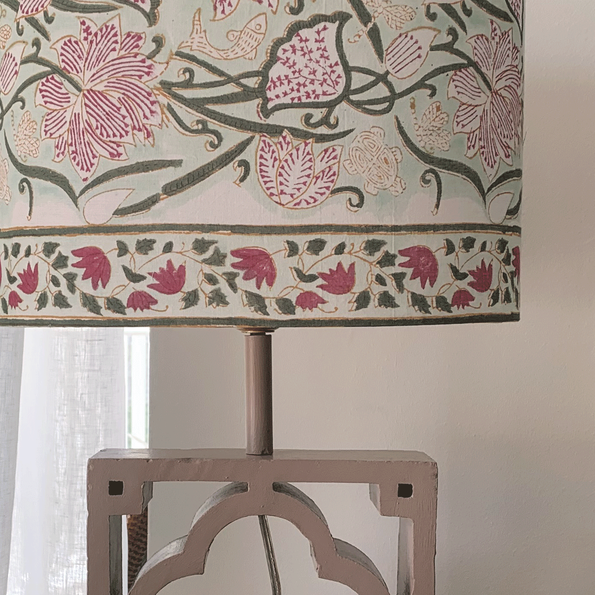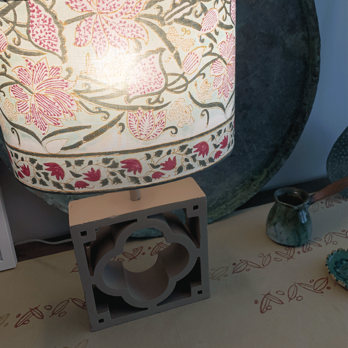 Claustra, a staple of Mediterranean architecture, serve as both practical and aesthetic elements, allowing air to circulate while casting shadows for shade. Having salvaged a few in Beirut, I envisioned repurposing them into charming table lamps. Originally crafted from clay, they've been revitalized with fresh paint. Paired with block-printed cotton lampshades, these unique creations bring a touch of Mediterranean flair to any corner of your home.