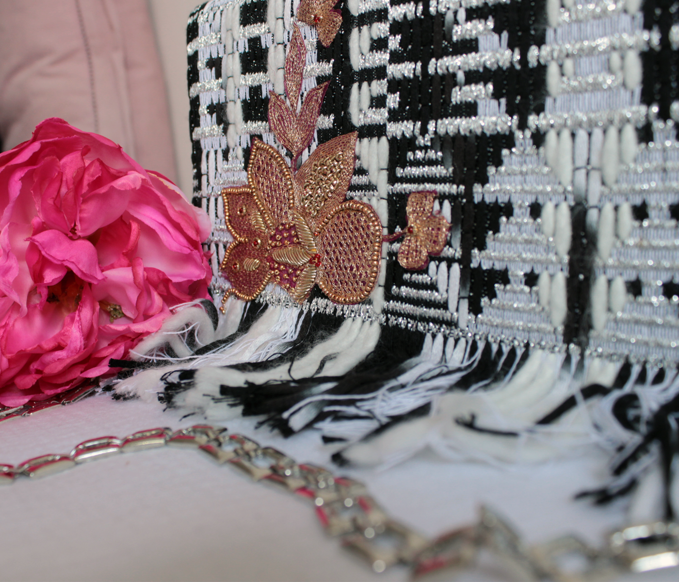 Experience elegance with our lightweight handmade handbag. Crafted from upcycled black and white tweed, sourced from haute couture deadstock, it exudes sophistication. The tweed is intricately woven with silver wool threads, adding a subtle touch of glamour. At the top of the bag, a stunning embroidered flower with gold thread and delicate pearls catches the eye. The clutch features a fashionable fringe and comes with a silver chain adorned with square-shaped accents. Rest assured, this ethical bag is meticulously handmade in collaboration with our partner workshop in Lebanon, supporting local artisans. Elevate your style with this exquisite accessory that combines beauty and sustainability.