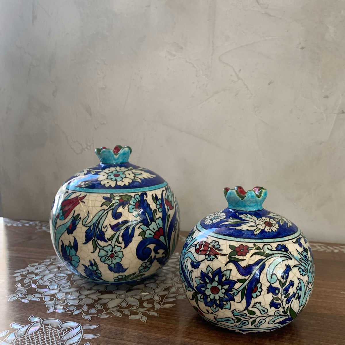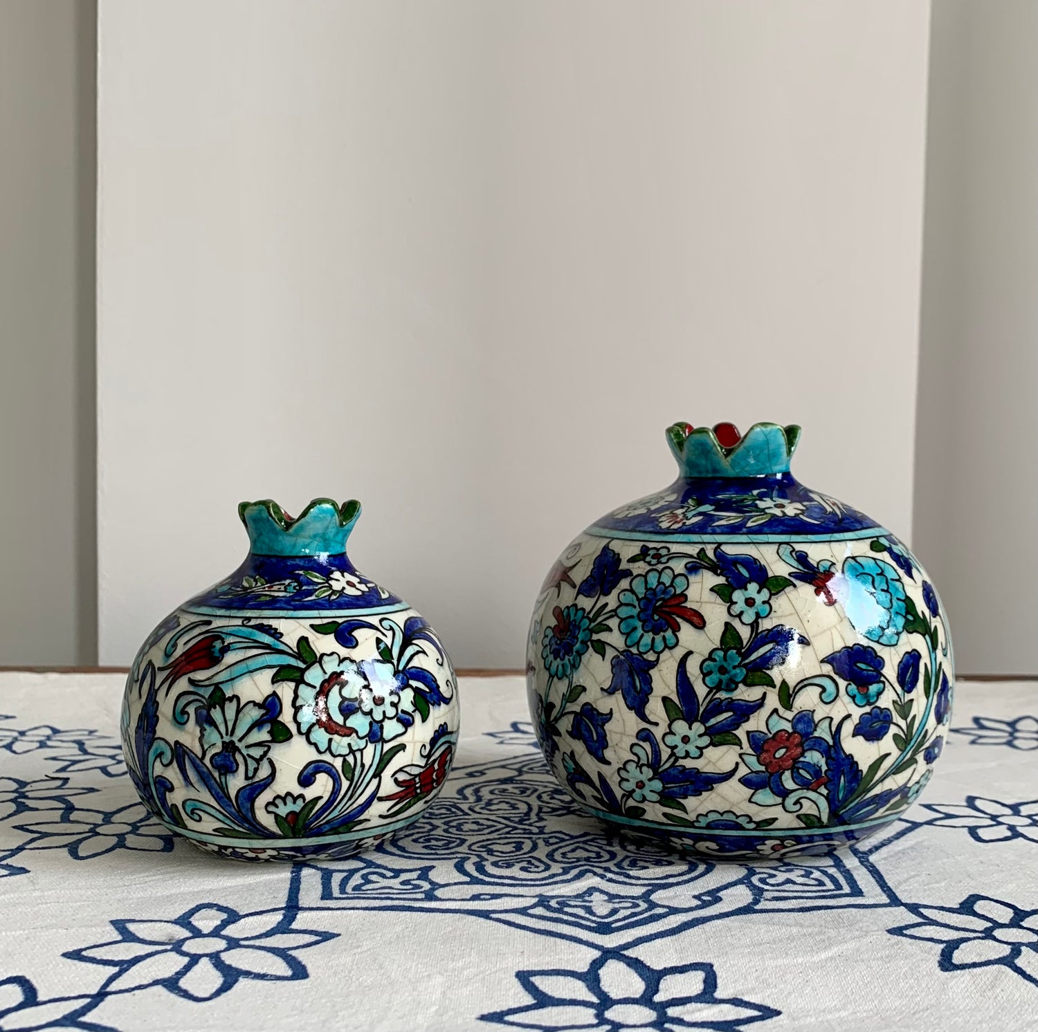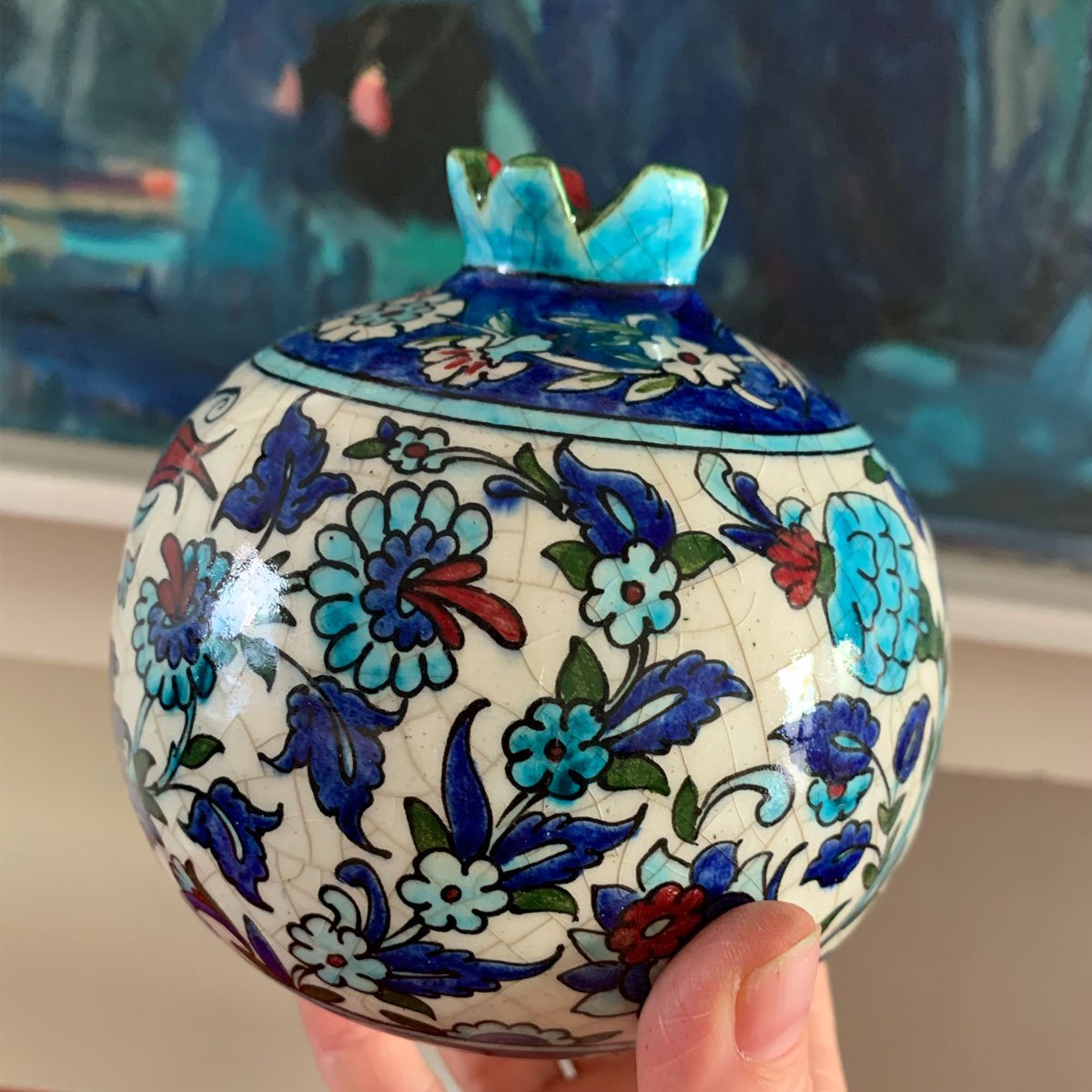 The journey starts here, with this Persian style pomegranate, delicately hand painted in azure, turquoise, Indian red and green. Azure was used along the Silk Road and connected to Neptune and its associated qualities of good fortune and compassion. The pomegranate can be used as a vase for dry flowers.
