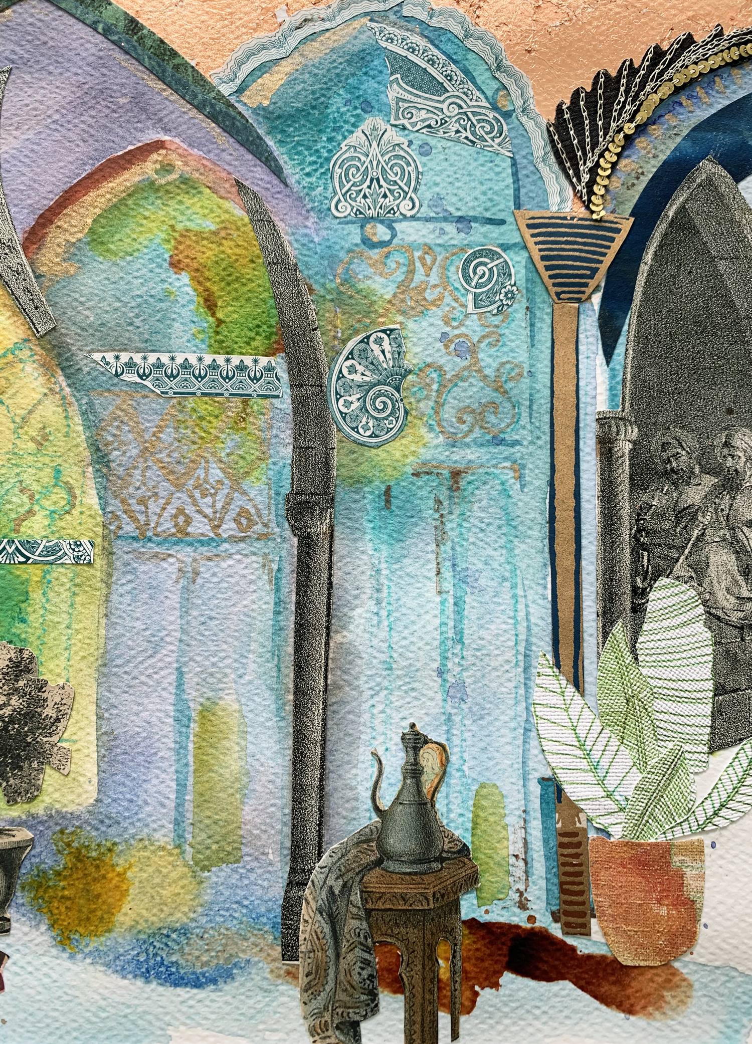 "It seems that there is in the brain a very specific area that could be called poetic memory, which records what has charmed us, what has moved us, what gives our life its beauty." Kundera. Perhaps it is this poetic memory that made me want to paint these multicolored arches, where one wanders and lingers, where one smokes a hookah or negotiates a carpet—images I have encountered so many times during my travels in the Middle East. I have punctuated this souk with gold leaf and collages to bring it even more to life.