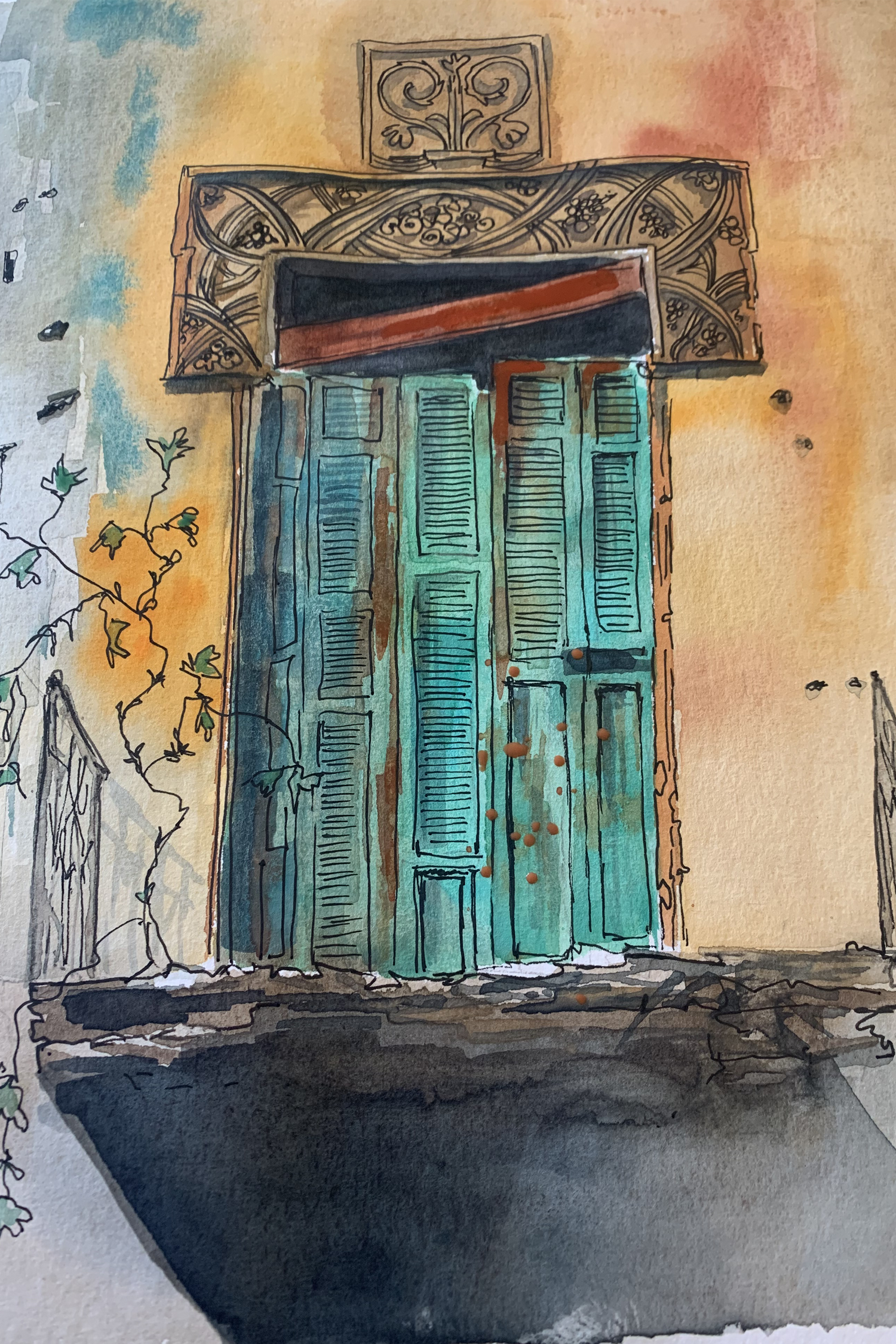 Résilience et beauté dans l'imperfection : aquarelle d'une porte cassée à Beyrouth