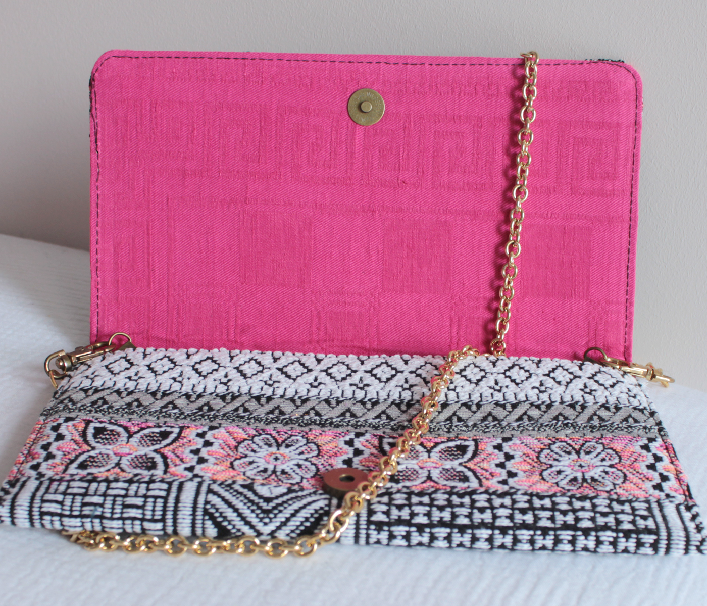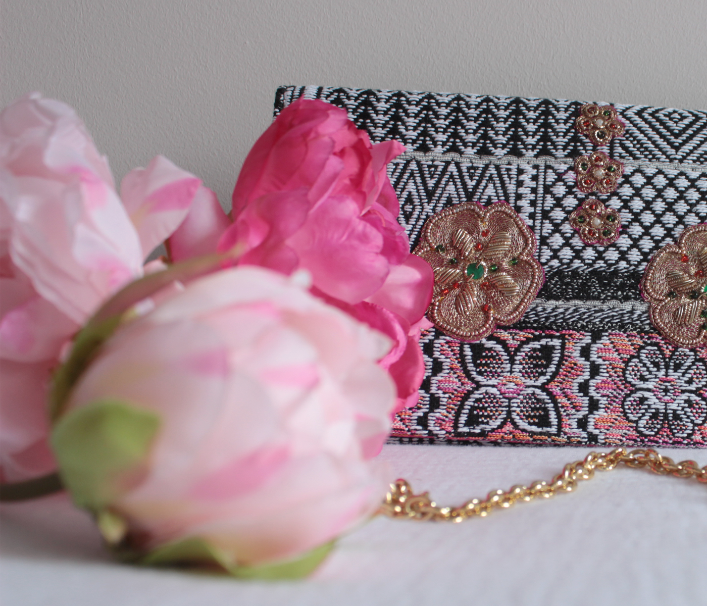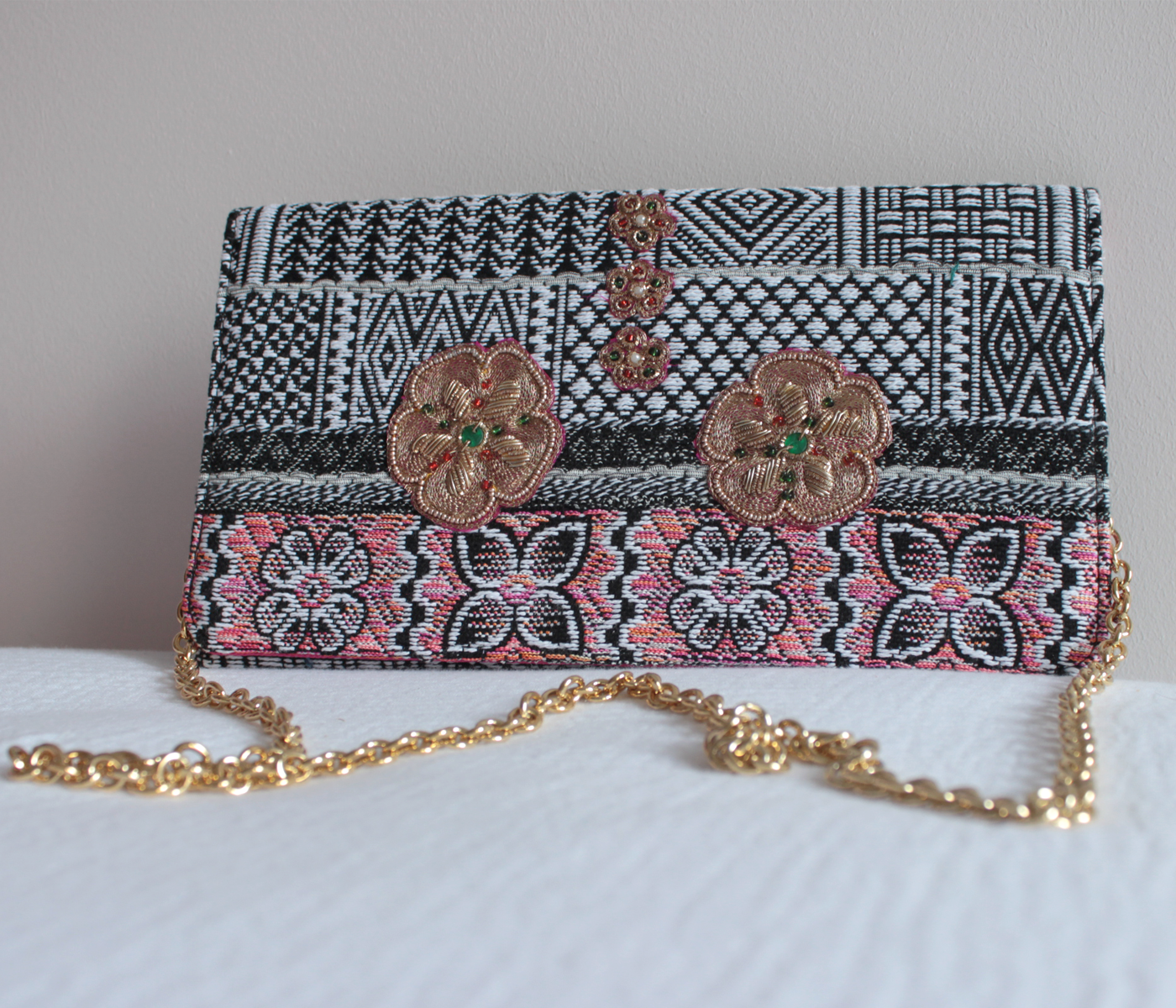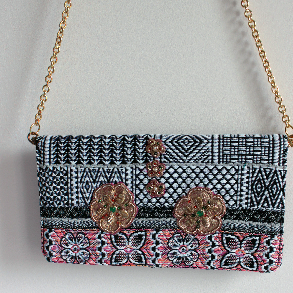 Voici notre superbe pochette faite à la main, ornée de fleurs brodées sur un tweed noir et blanc avec une doublure vintage rose vif. Fabriquée de manière éthique au Liban, chaque pochette est unique et est livrée avec une élégante chaîne en or. Parfaite pour les mariages et les occasions spéciales, cette pochette est une véritable fleur parmi les fleurs.