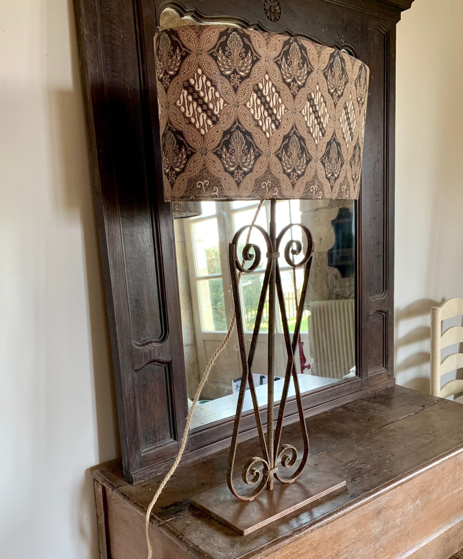 A statement lamp upcycled from an early 20th c. balustrade salvaged in Egypt. We like the harmony and balance that emerge from this lamp with its perfect symmetry. We carefully kept the original greyish green patina and matched the base with a spectacular silk shade. The hues of mixed browns and beige magically turn gold when the lamp is on.