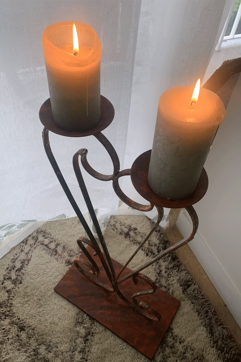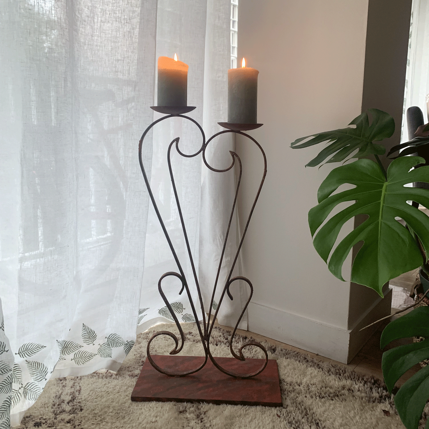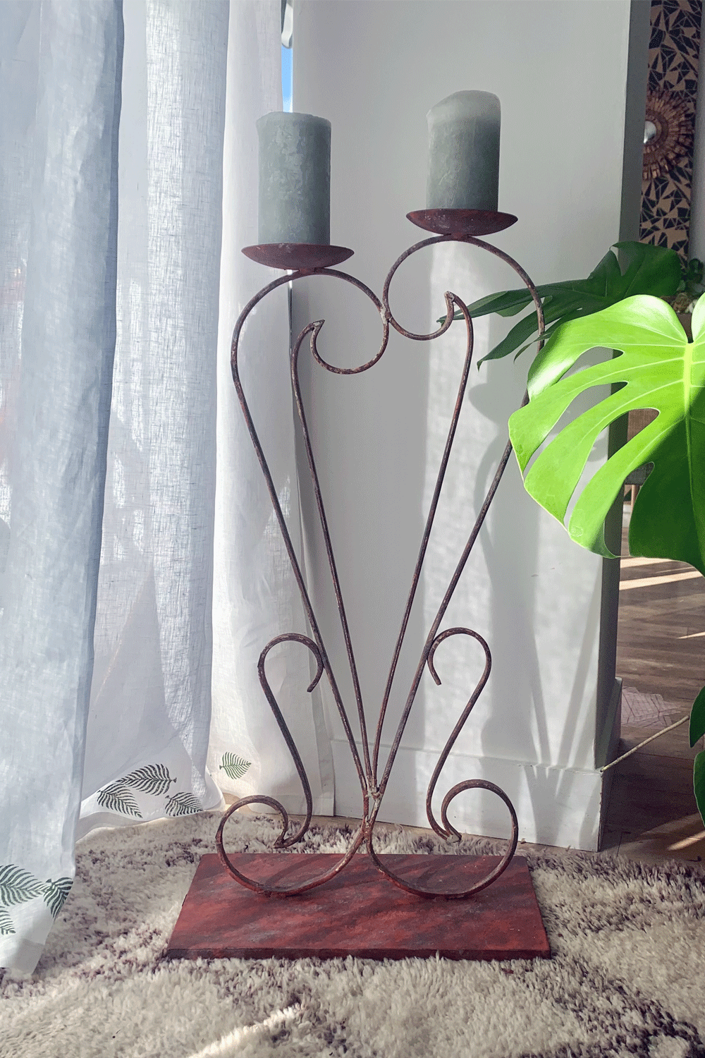 Upcycled from a vintage gate found in Lebanon dating back to the 1940s, thiis candelabra carries a rustic charm with its warm patina in shades of red, orange, and brown. With its whimsical design resembling a swan, this candle holder adds a touch of charm to any space. Its two branches elegantly hold two candles, spreading warmth and coziness to every corner of your home. Bring a piece of history into your decor and let this charming candle holder brighten up your living space with its distinctive character.