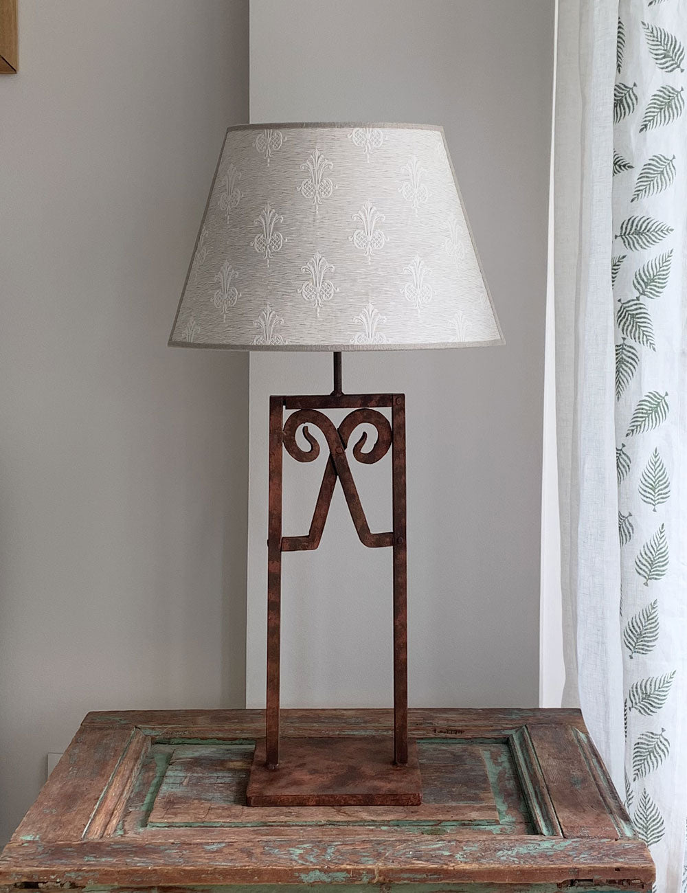 C'est la rencontre insolite entre une lampe recyclée récupérée d'un balcon forgé à la main dans les années 20 et un abat-jour chaleureux en lin, imprimé au bloc. La lampe porte encore ses rivets et ses fers carrés typiques de la période Art Déco.