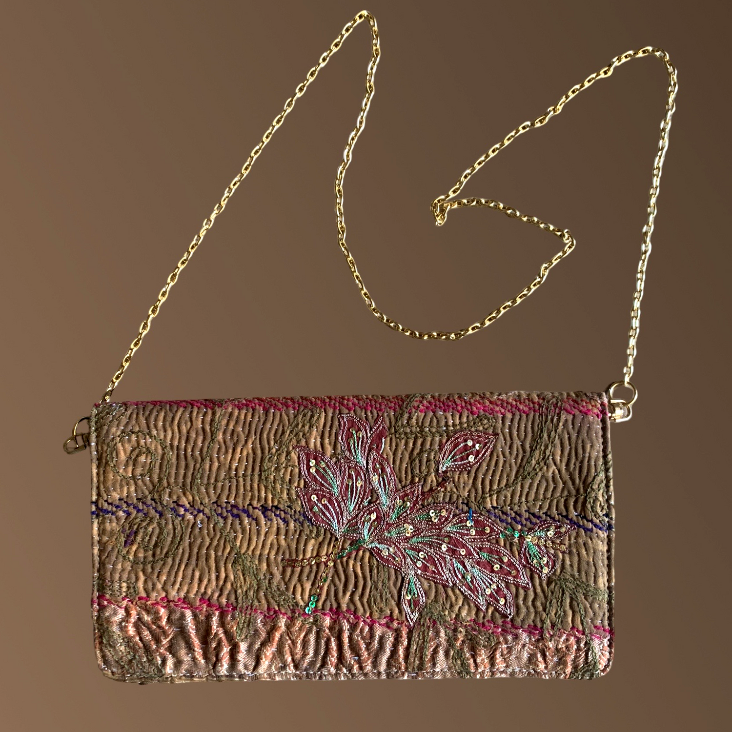 C'est une belle pochette fabriquée à la main avec un tissu Kantha vintage cuivré orange chaud, orné d'un bouquet de feuilles brodées Bordeaux. La pochette est dessinée en France et fabriquée à la main au Liban par Koko, dans son atelier.