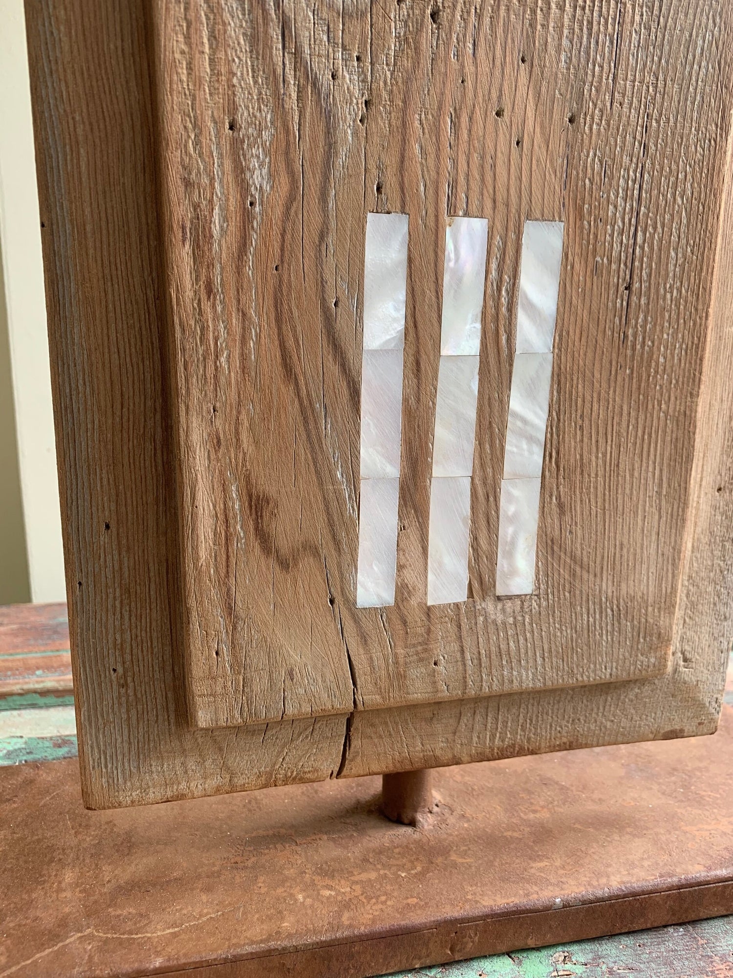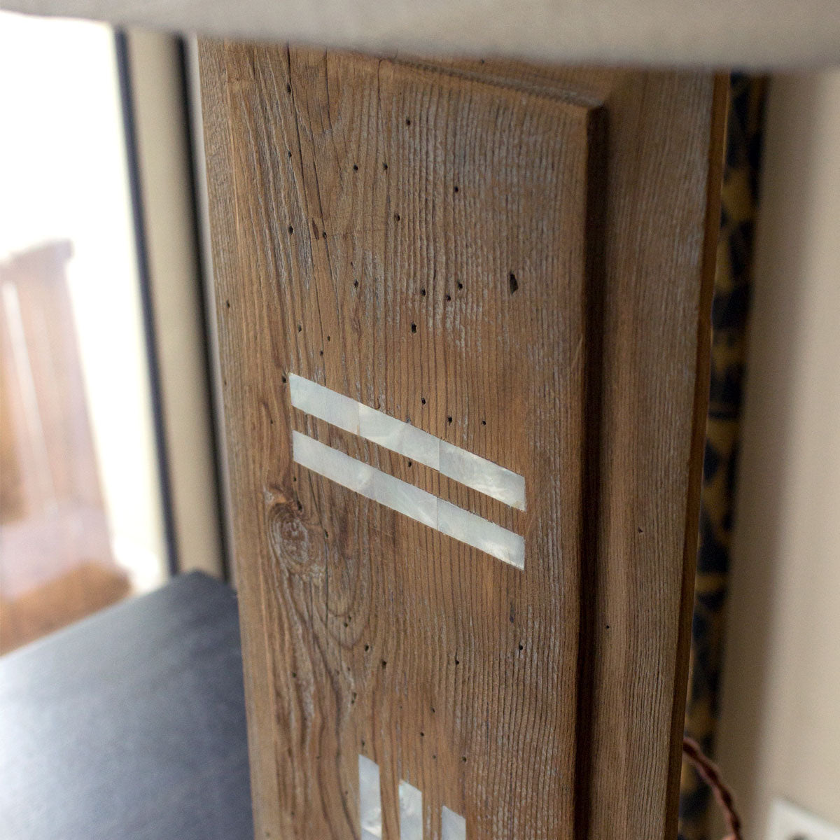 À partir d'une porte en bois vintage trouvée au Liban, nous avons créé cette lampe de table unique. Nous avons décidé d'accentuer le bois du panneau avec des incrustations de nacre. Il rehausse la beauté brute du bois veiné.