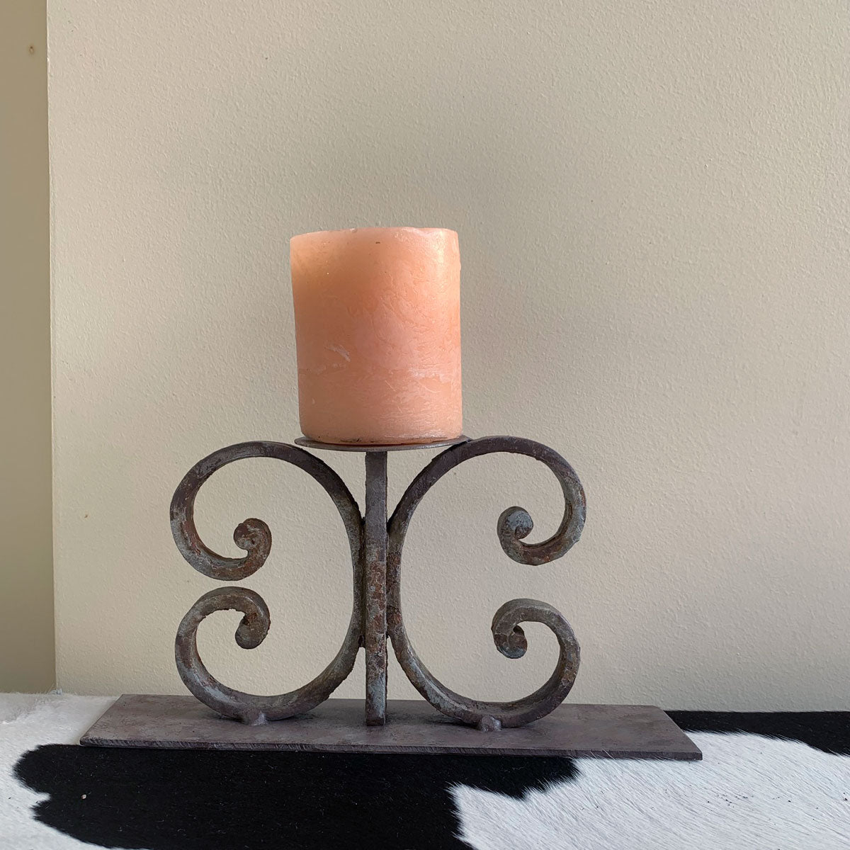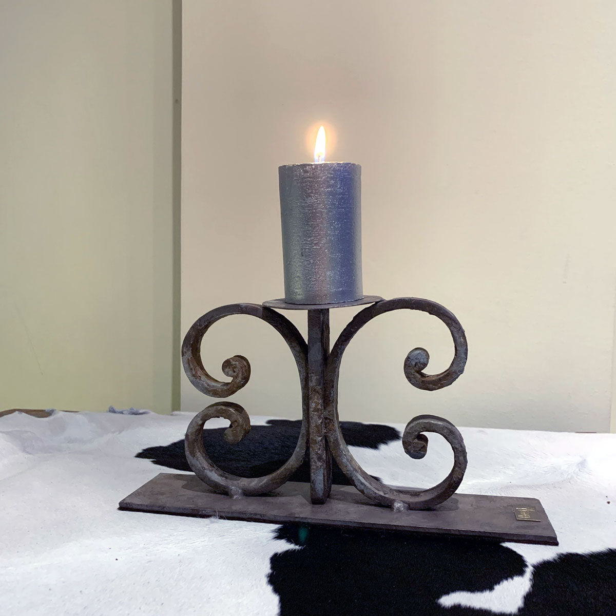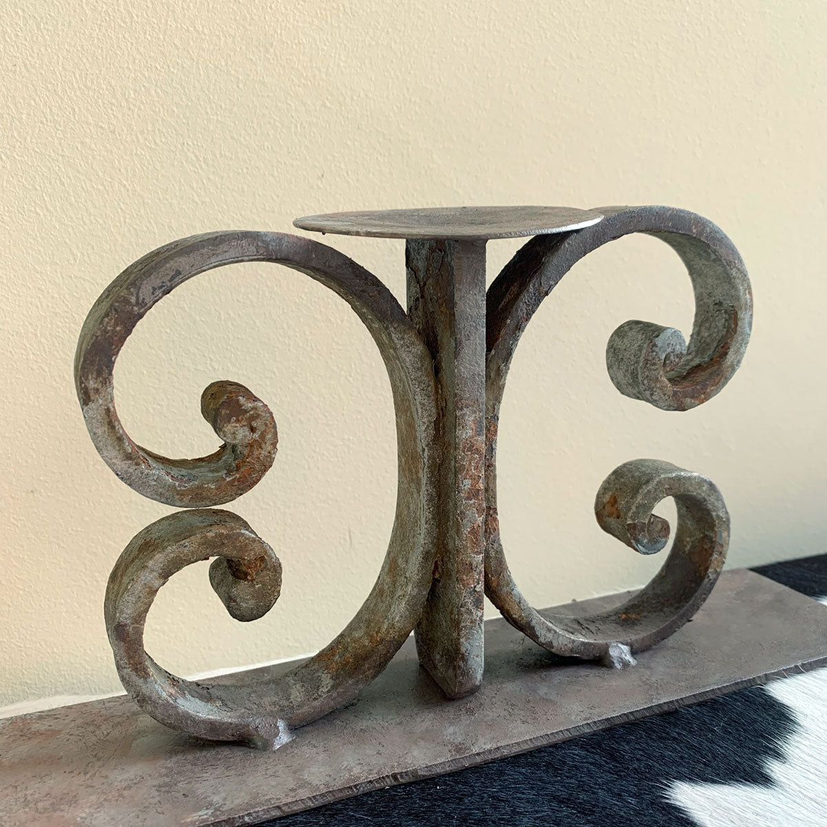 - Un bougeoir polyvalent et magnifique qui peut trouver sa place dans tous les coins de votre maison ! Provenant d'un portail en fer récupéré en France, il porte encore ses cicatrices, preuves de son authenticité. Nous avons ajouté une base en métal et appliqué plusieurs couches de patine, avec des teintes de gris-brun et d'argent.