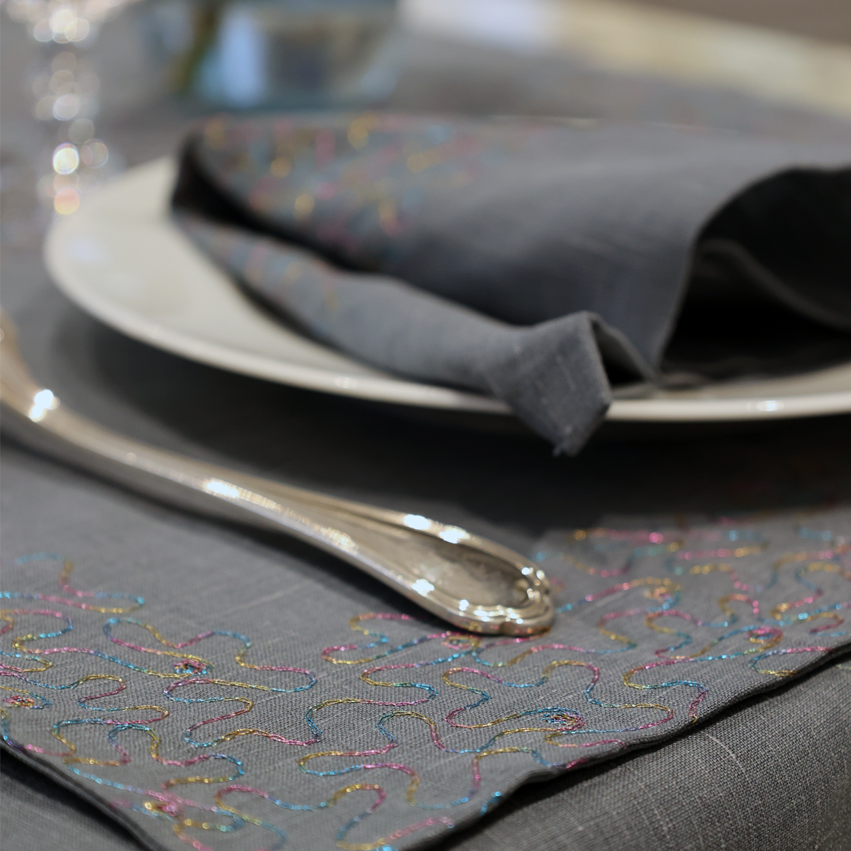 Here is a delightful set of placemats, where a delicate pastel thread glides through the blue linen in soft loops, resulting in a sophisticated and refined look. The placemats can be used on its own or matched with our lovely napkins, creating a comprehensive and complete appearance.
