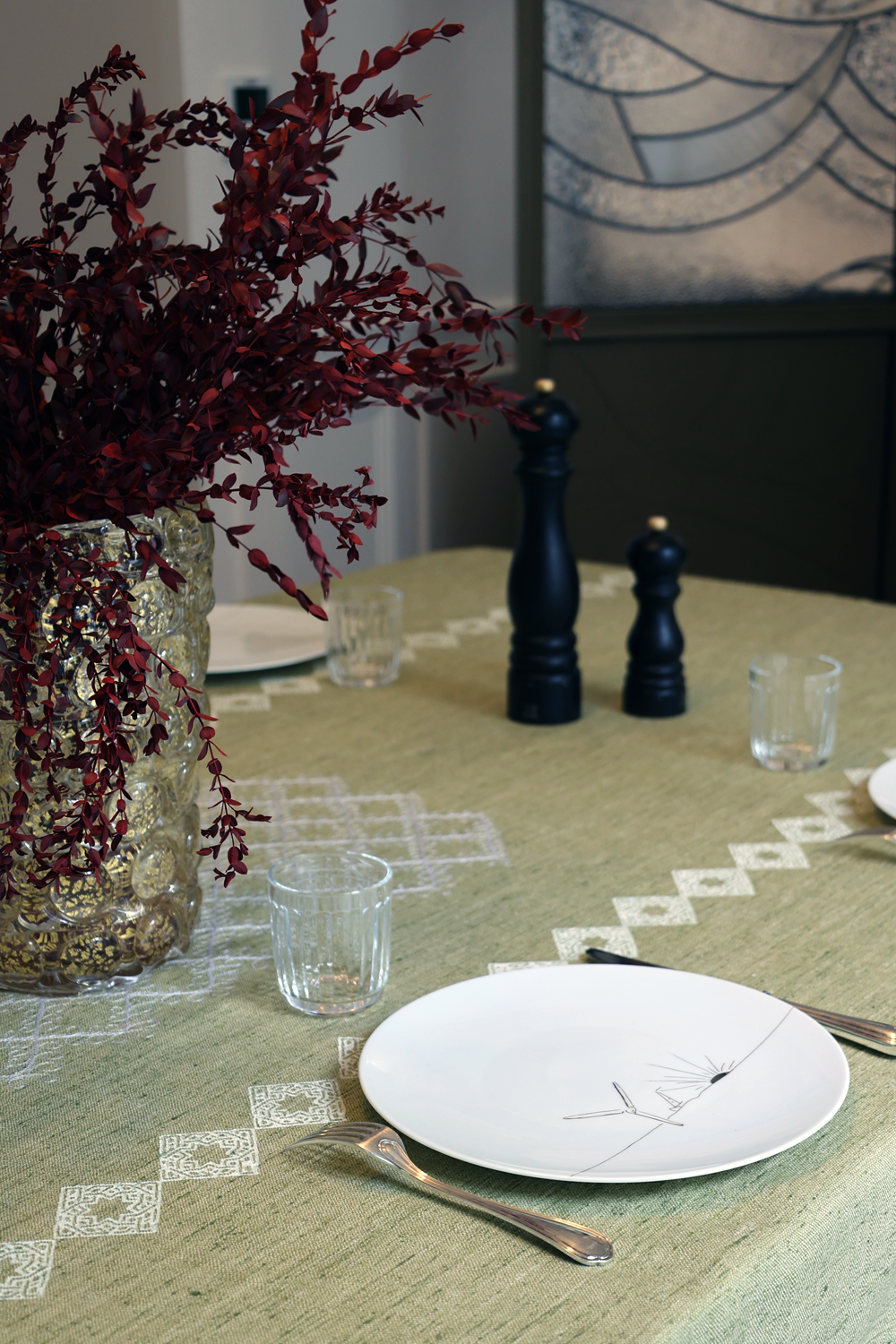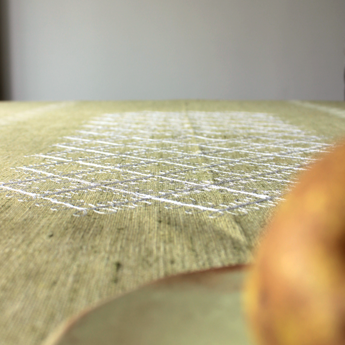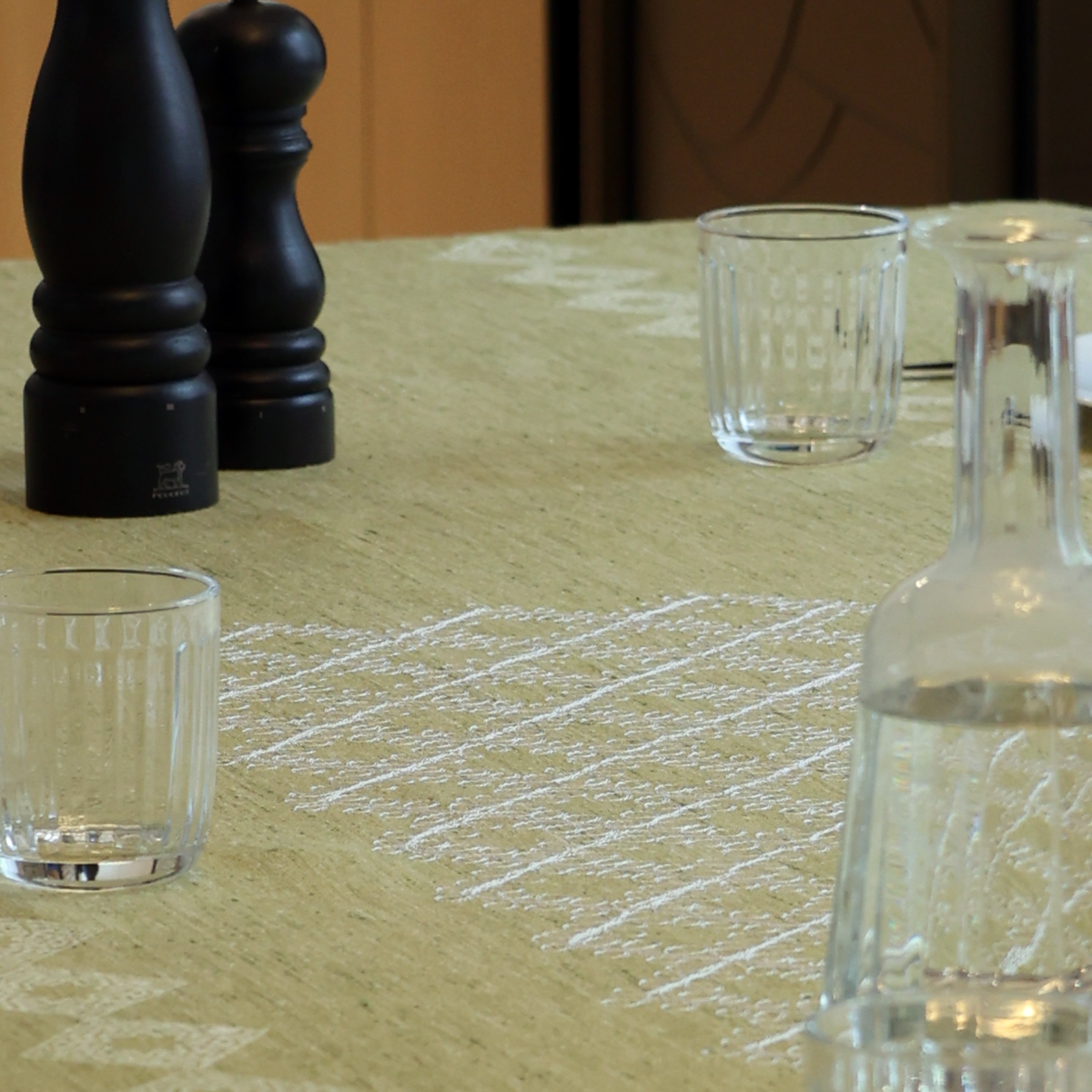 The diamond shape is the central theme of this tablecloth, which is showcased through both techniques. The embroidered rectangle of diamonds in the center of the tablecloth is bordered by two long bands of block printed diamonds on each side. The pure white embroidery on the anis green linen creates a fresh effect that is perfect for summer.