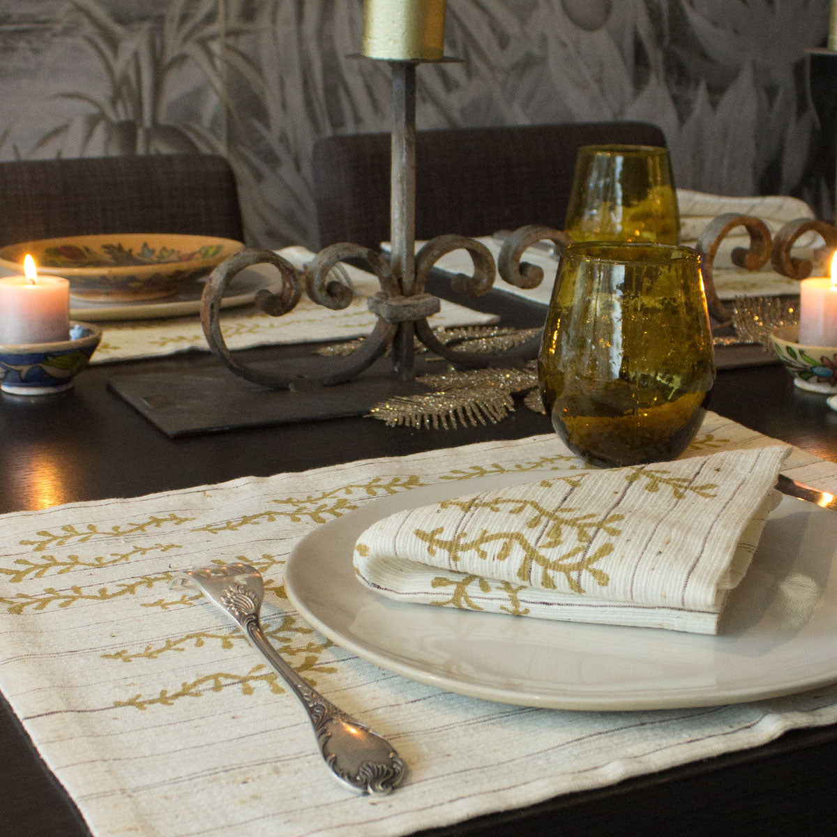 Running through the striped off-white linen, one can guess algae hand printed in a dancing waves. Definitely a fresh look for your dinner table, matching these block print linen table mats with your favorite porcelain dishes.