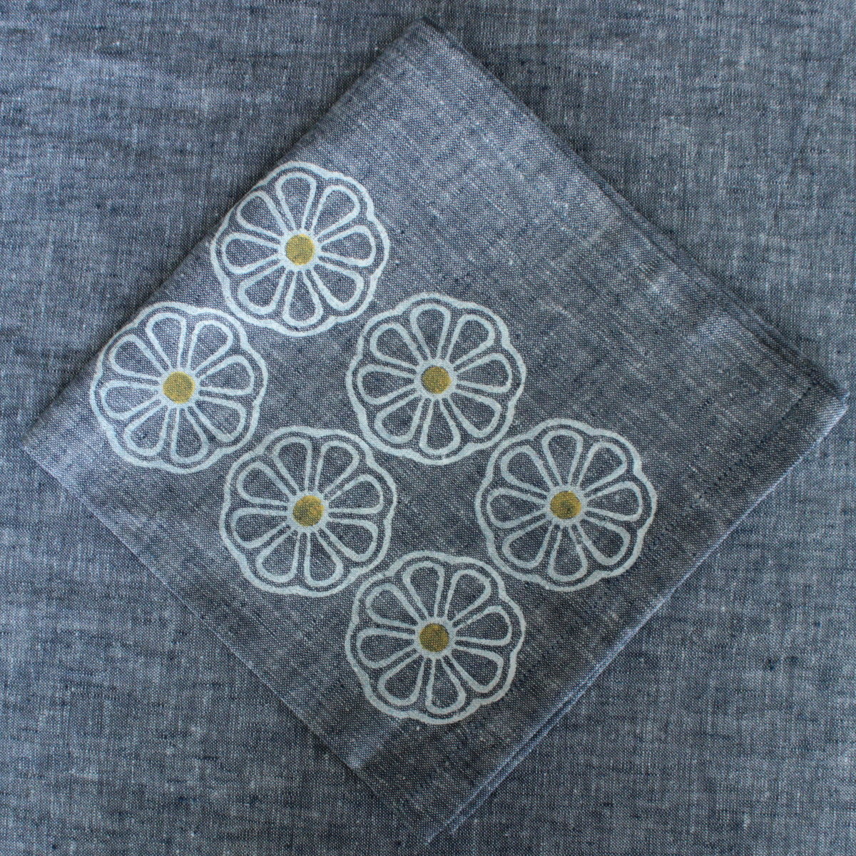 We have chosen to block print white daisies with yellow hearts in a regular block on the upcycled Blue Jean Linen.