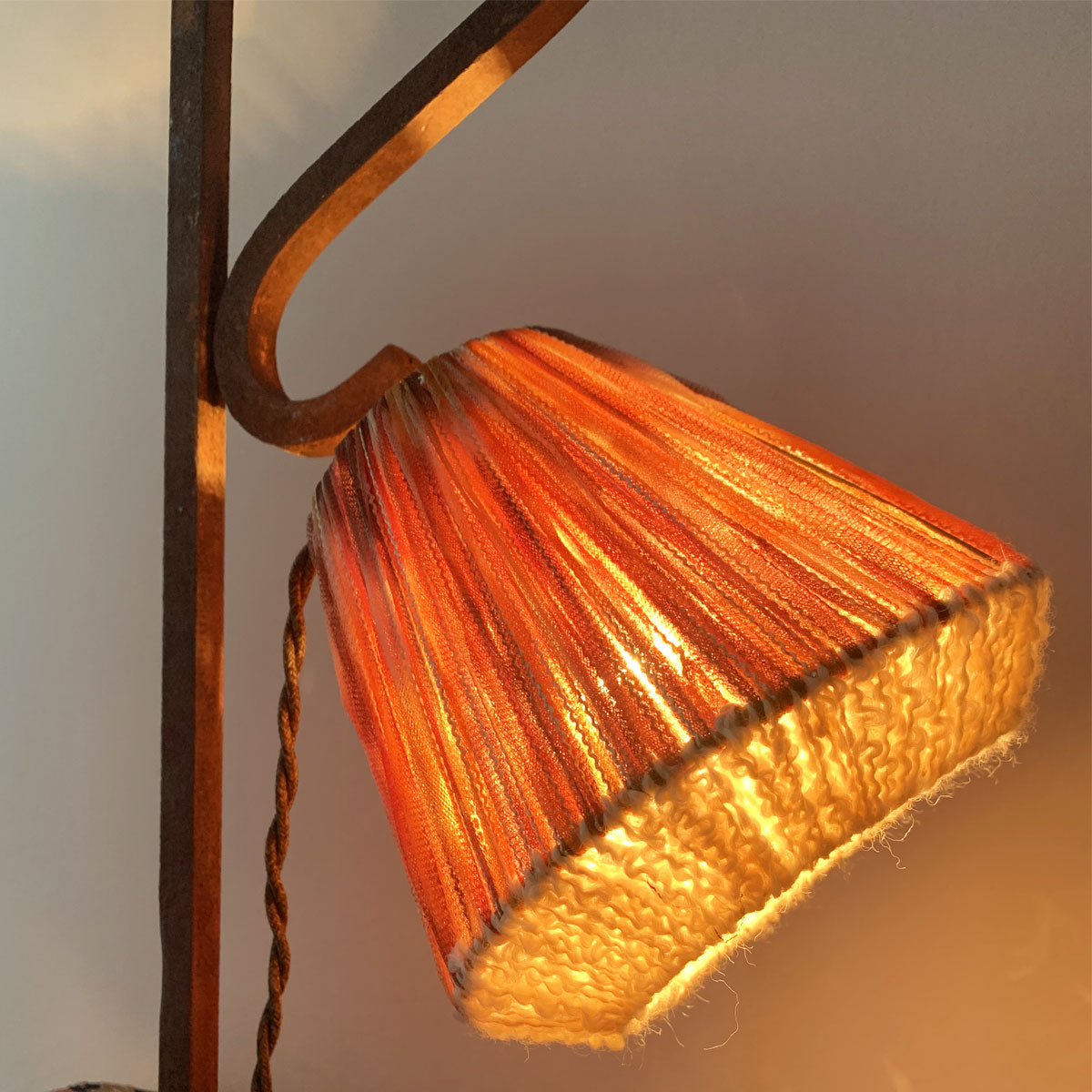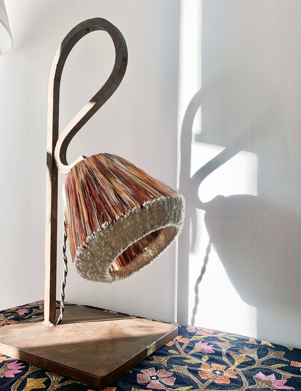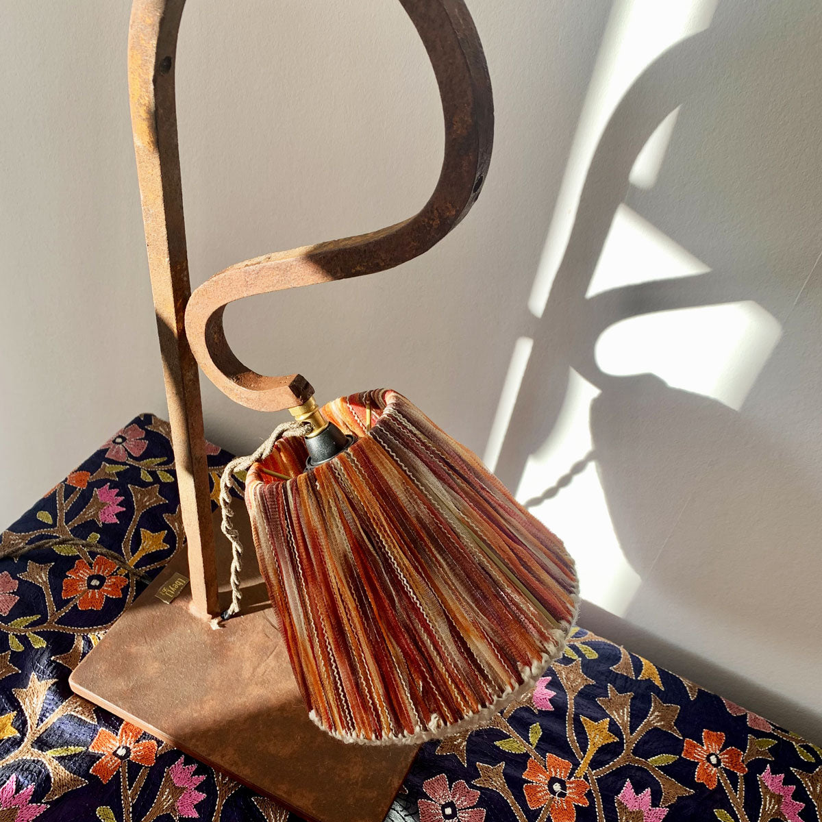 The Cocoon lamp will comfort you during long winter evenings. Its shade, woven with silk ribbons and off-white wool threads, features an unusual shape that softens the geometric wrought iron base. This unique piece is crafted entirely from reclaimed materials, including the balustrade, a former Lebanese balcony element in square iron, and the ribbons, sourced from high-fashion end-of-stock. A piece rich in history to warm up your favorite corner.