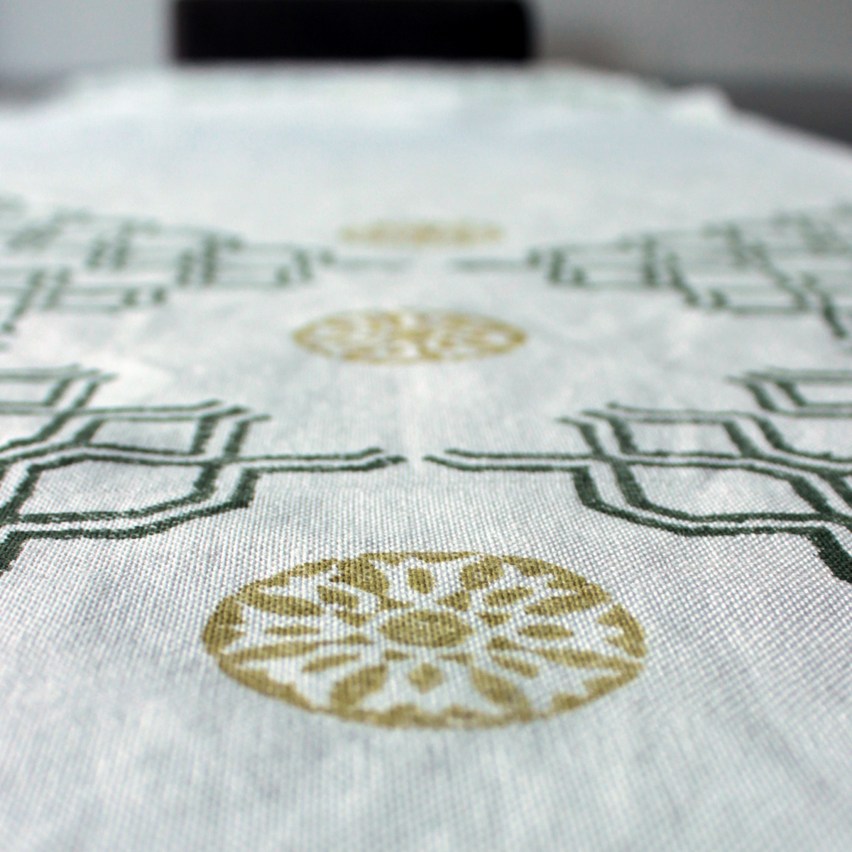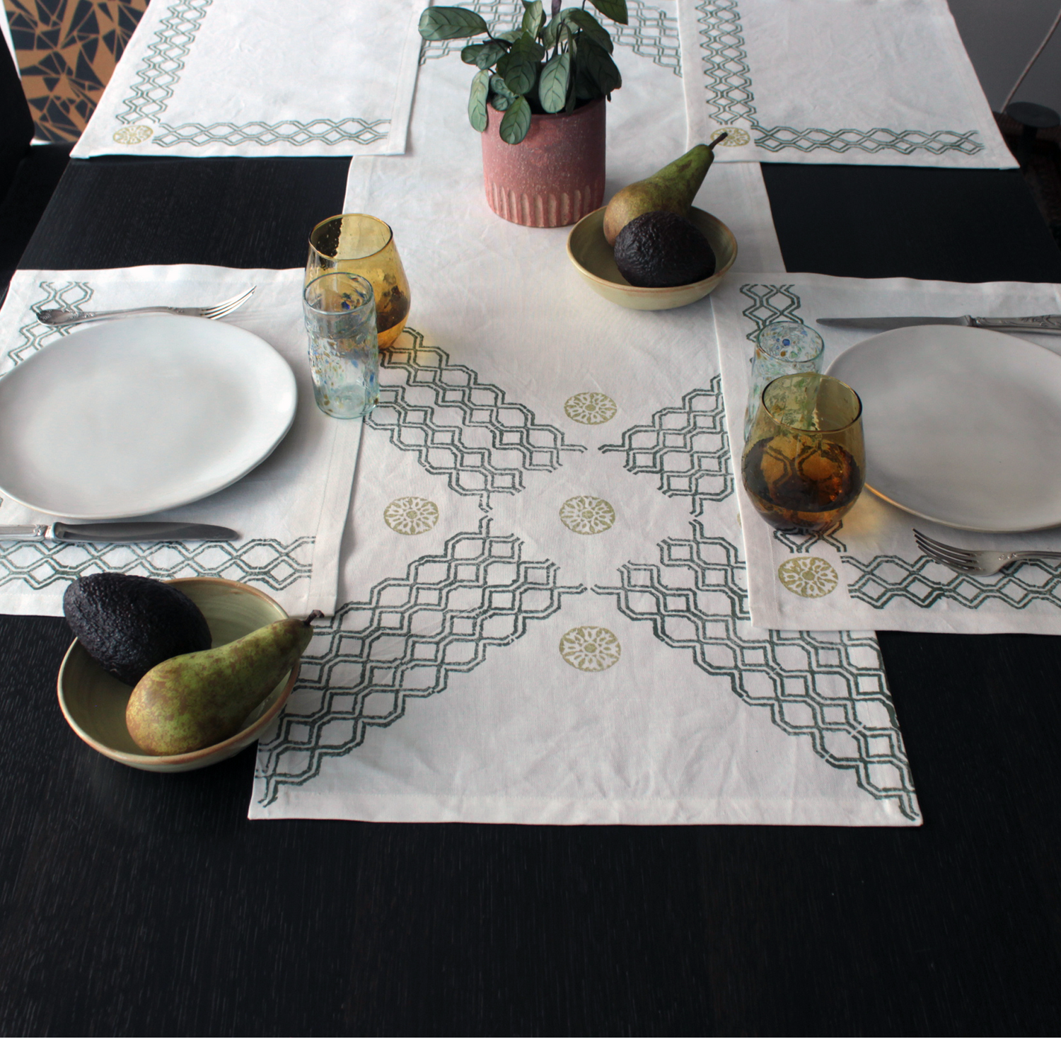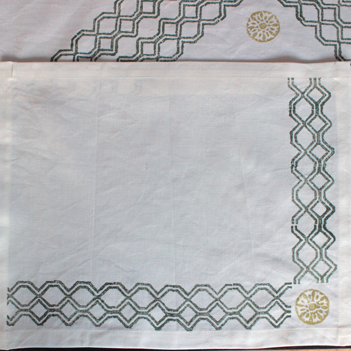 Charming set of placemats and block print runner : the perfect addition to any country dinner table! These gorgeous pieces feature a lovely lattice pattern with delicate floral elements, all block printed in soft and soothing hues of olive green and ochre on pure linen.