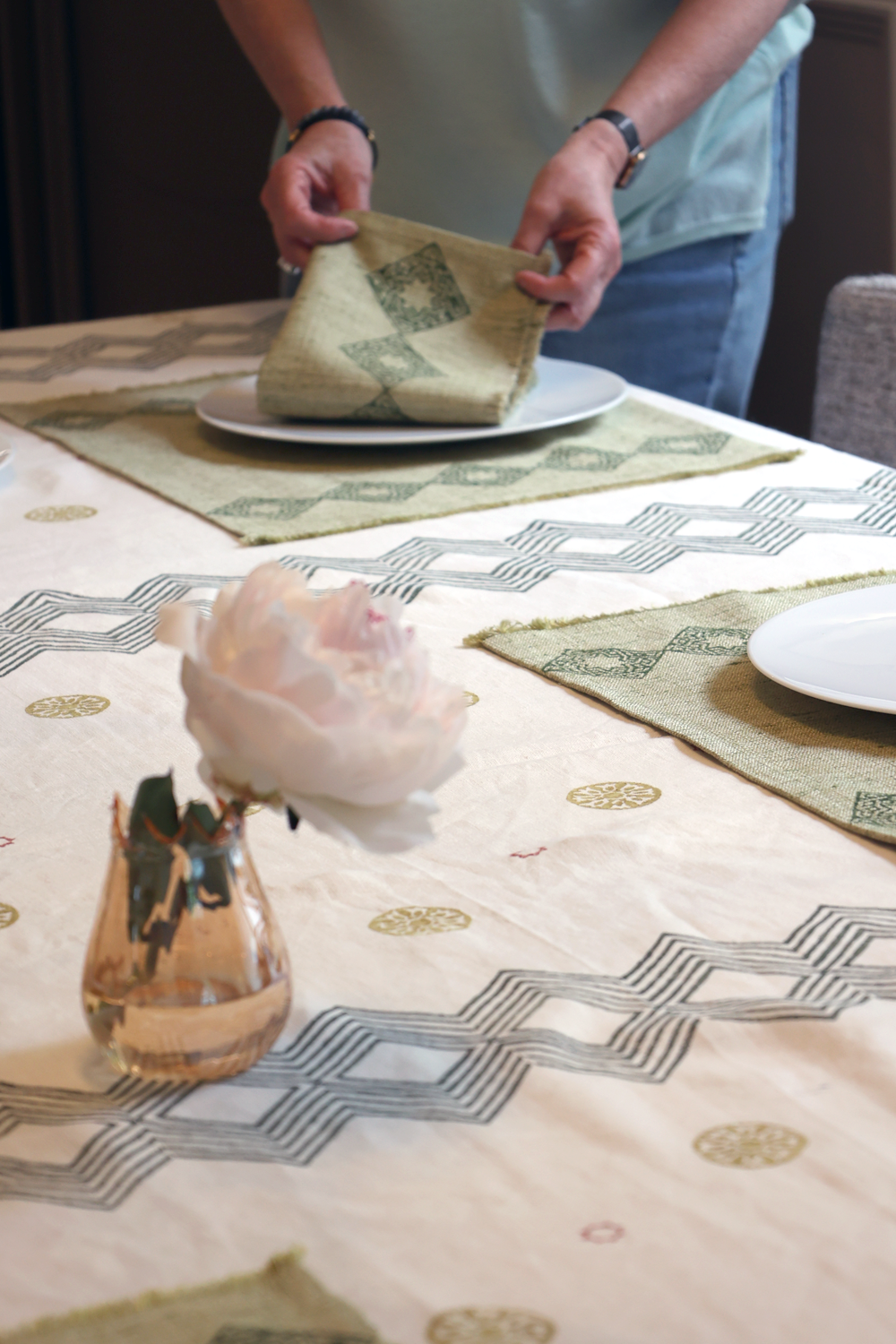 The collection showcases a range of clear linens that are block printed with unique patterns in harmonized colors of greens, ochre, terracotta and deep blue. The prints include a combination of geometric shapes, graphic elements, and floral designs, creating a cohesive collection where all pieces complement each other perfectly.