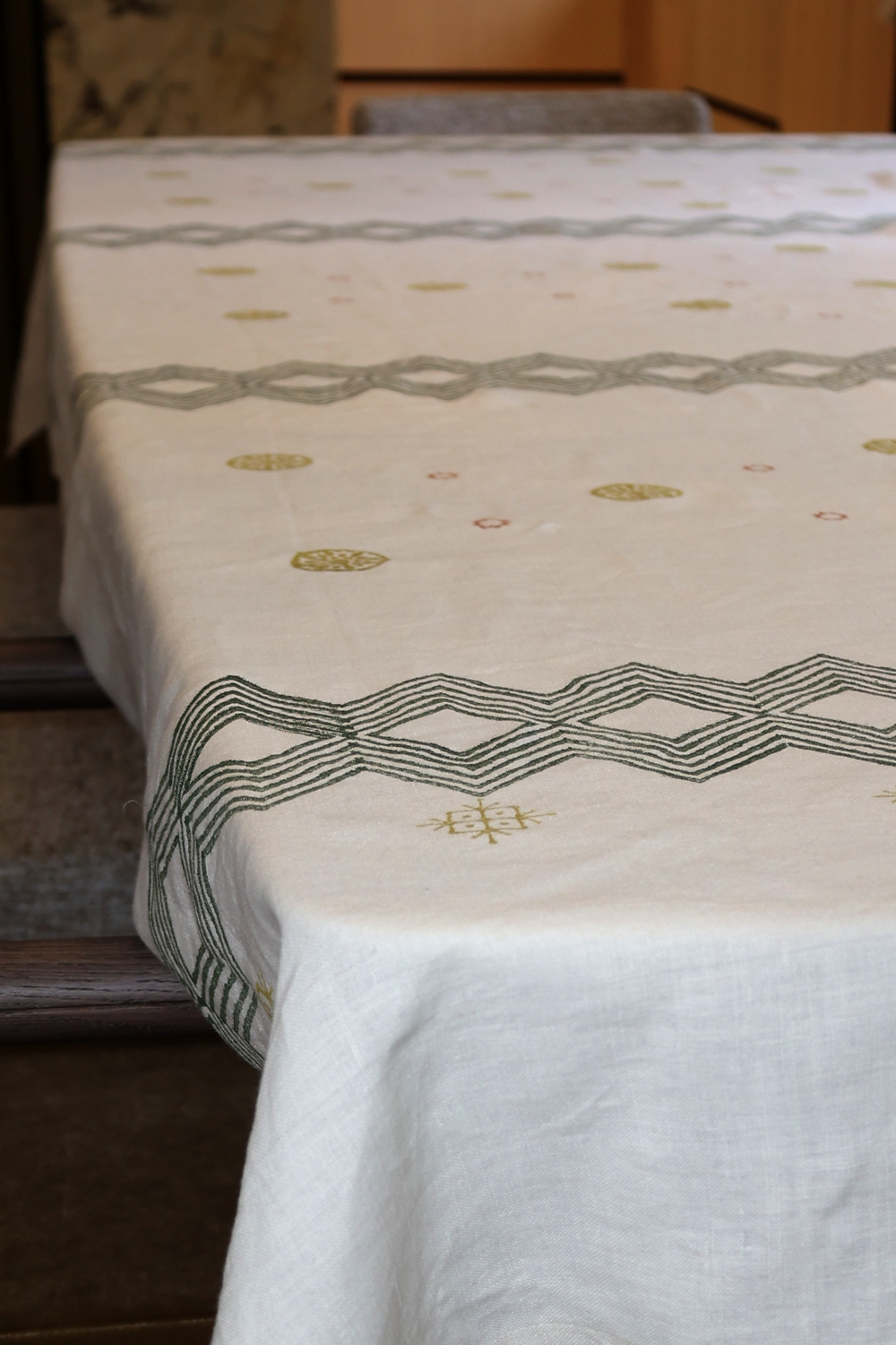 This tablecloth is printed with an alternance of diamonds in forest green and small circles in ochre. This clean and minimalist tablecloth is a beautiful addition to any table setting and tells a story of heritage and crafts. It is also eco-friendly, as all linens are made from European fabric deadstock.