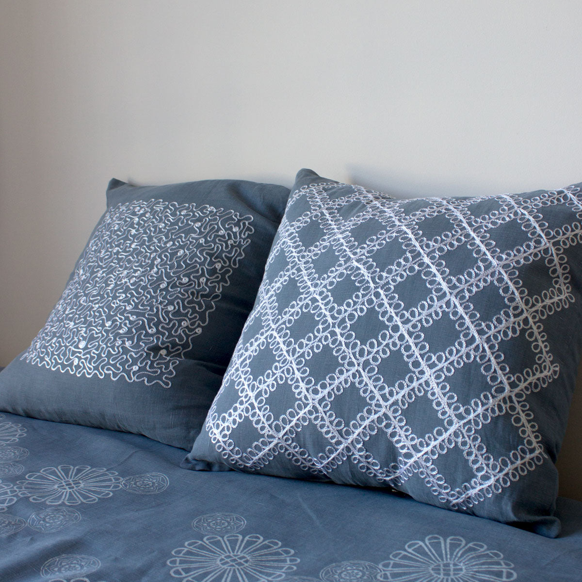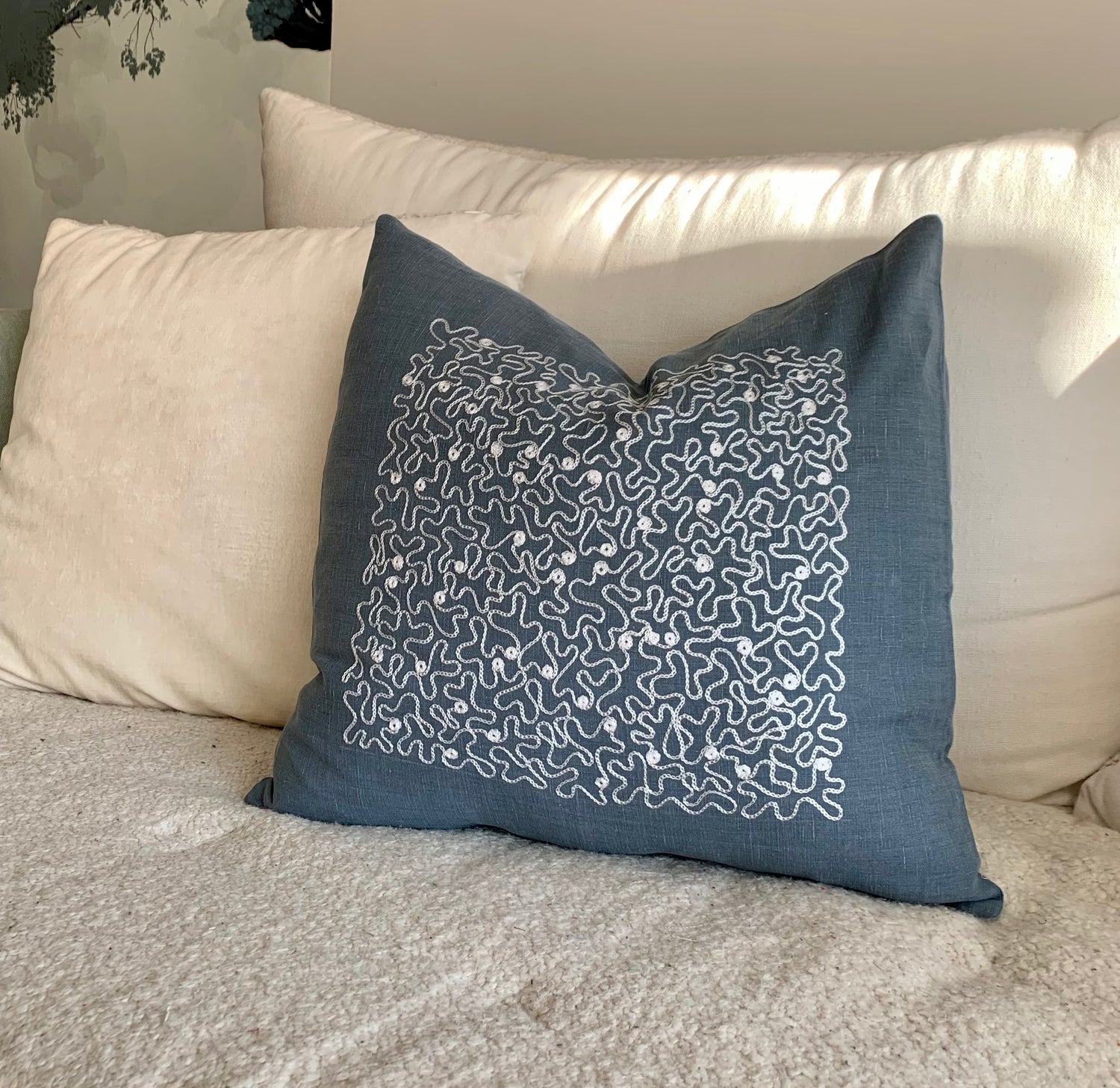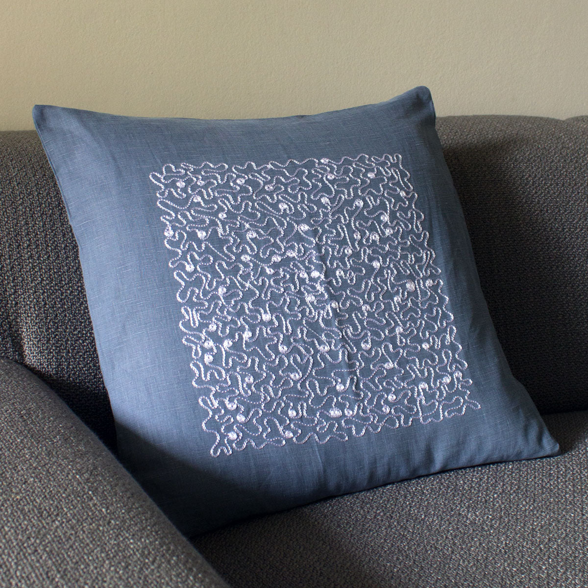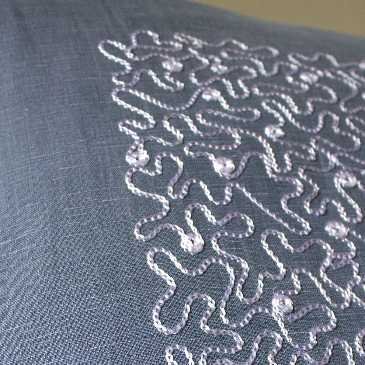 The pattern of this throw pillow cover shows curls embroidered with a silk thread, turning into loops on a blue gray linen. The semi manual embroidery "aghabani" technique is part of a remarkable savoir-faire initiated in Aleppo, Syria more than 150 years ago.