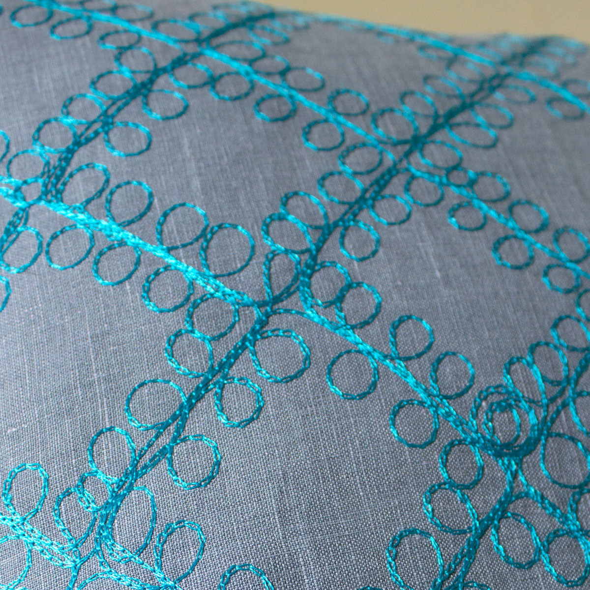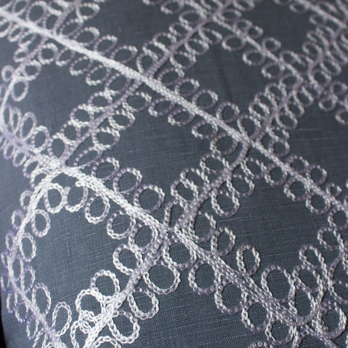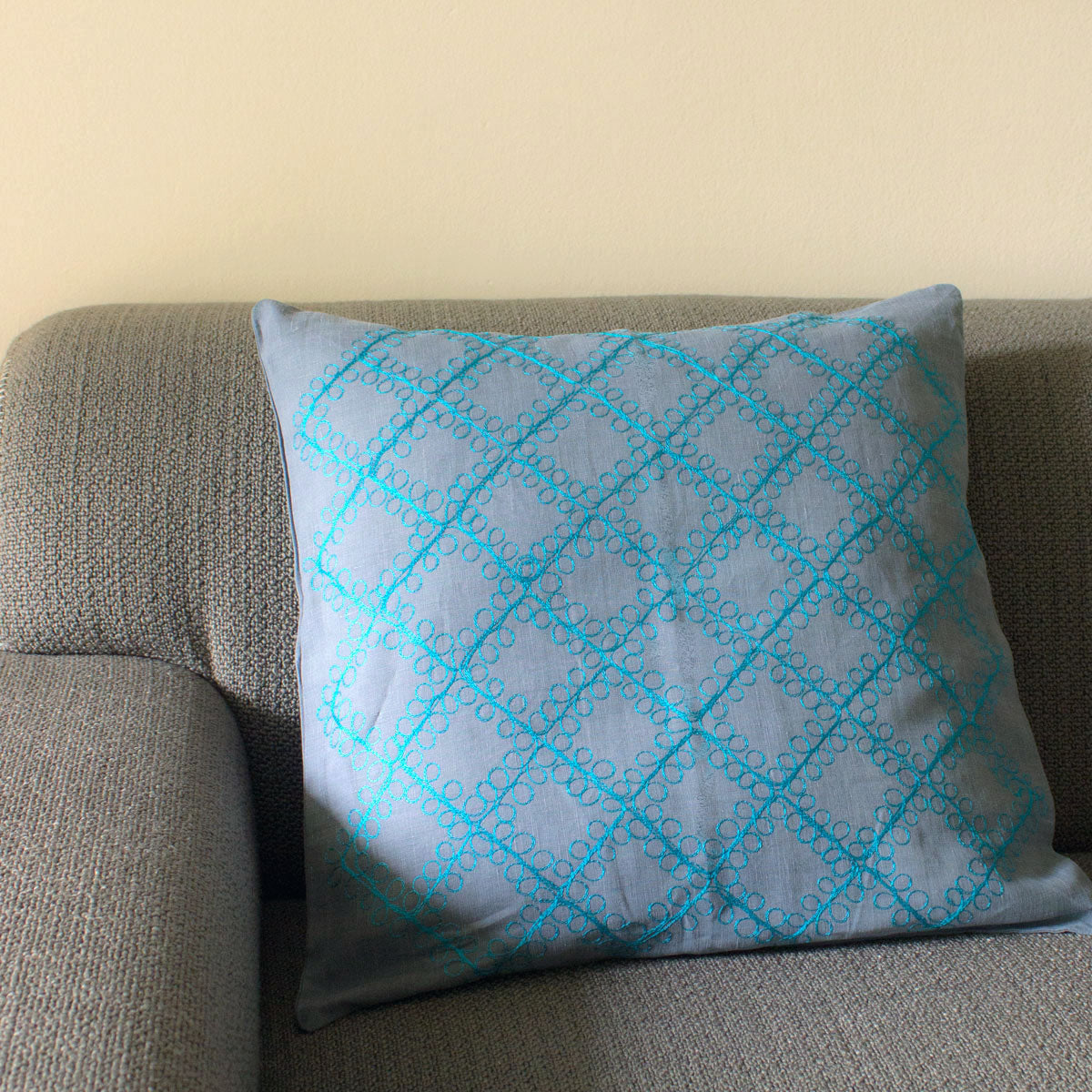 The pattern of this throw pillow cover shows diamonds embroidered with a silk thread, turning into loops on a blue gray linen. The semi manual embroidery "aghabani" technique is part of a remarkable savoir-faire initiated in Aleppo, Syria more than 150 years ago.