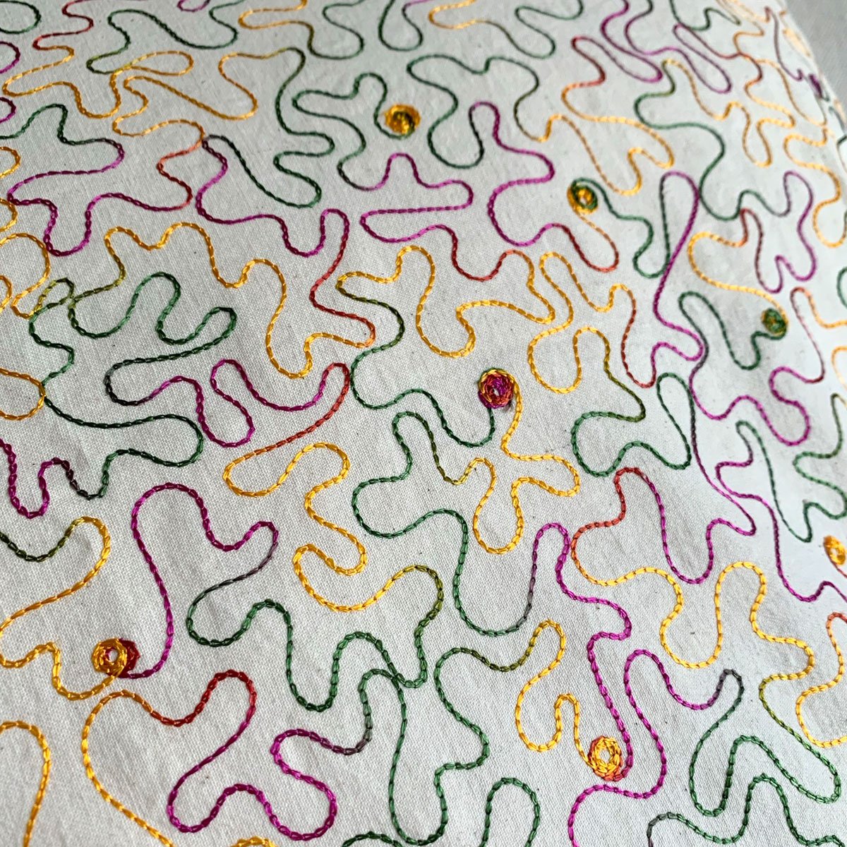 Off-white embroidered raw cotton with pink, yellow and green