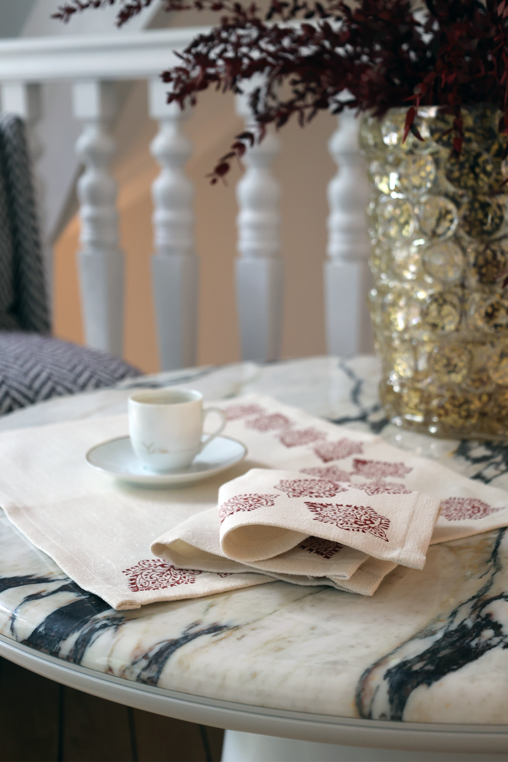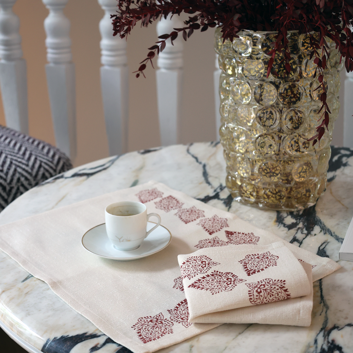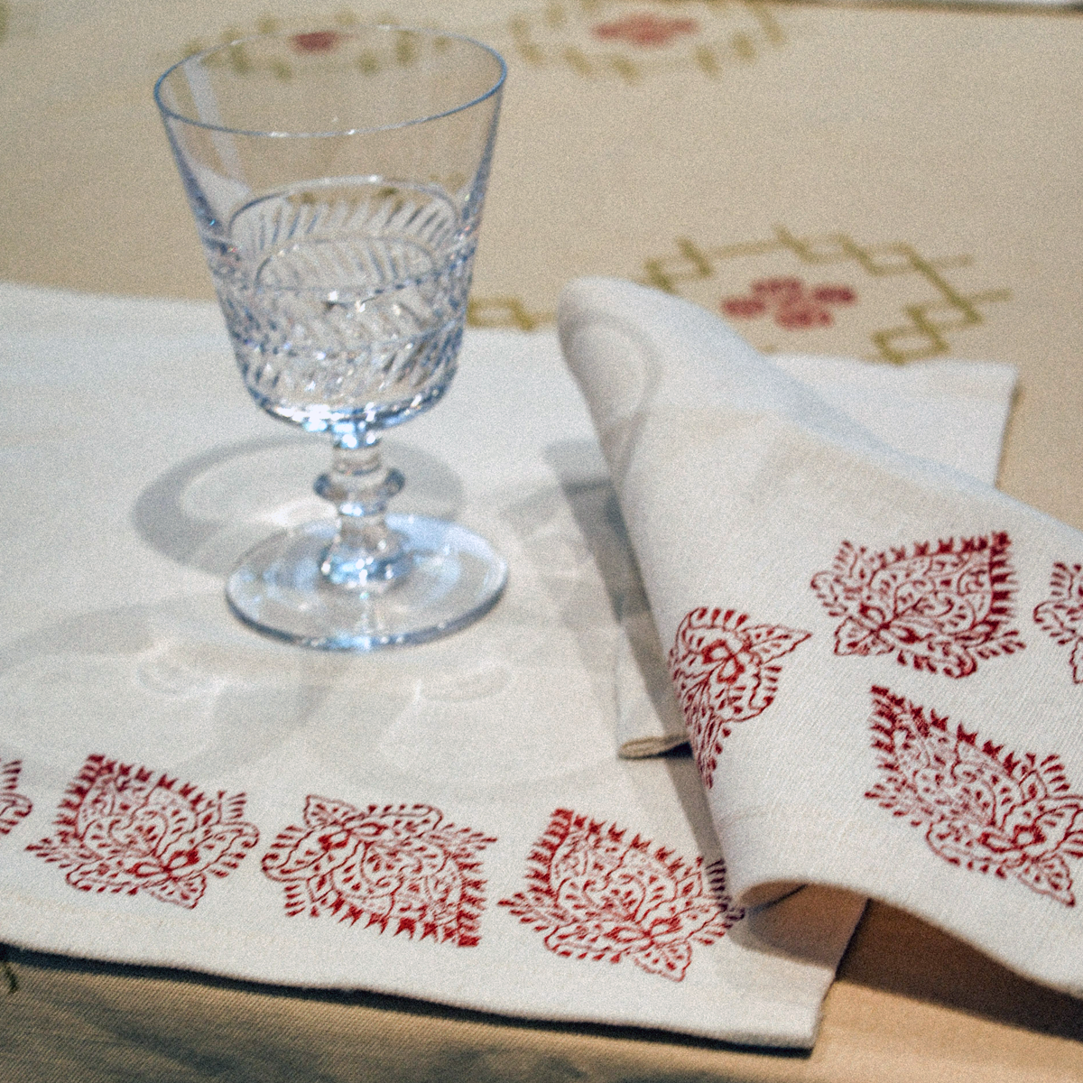 Introducing our Off White Linen Placemat and Napkin from the summer collection. Made from pure linen sourced from luxury fabric deadstock, these placemat and napkin feature a gracious leaf block printed with a wood stamp. Designed in France and made in Lebanon, it's available in ochre and warm red and adds a touch of elegance to any table setting. Plus, it's an ethical and unique choice for those who value sustainability.