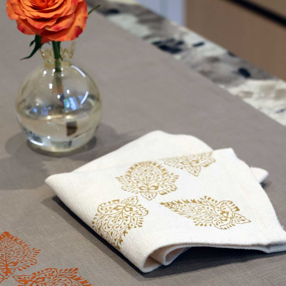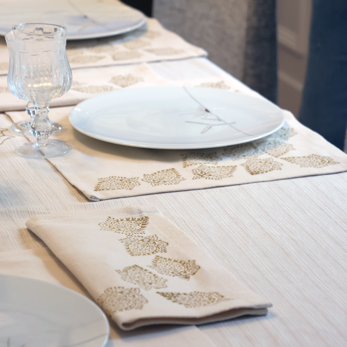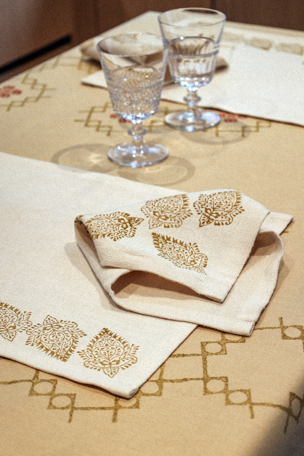 Introducing our Off White Linen Placemat and Napkin from the summer collection. Made from pure linen sourced from luxury fabric deadstock, these placemat and napkin feature a gracious leaf block printed with a wood stamp. Designed in France and made in Lebanon, it's available in ochre and warm red and adds a touch of elegance to any table setting. Plus, it's an ethical and unique choice for those who value sustainability.