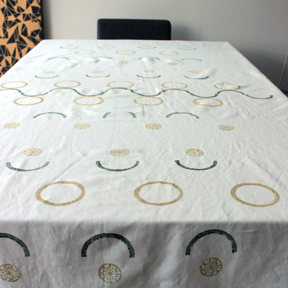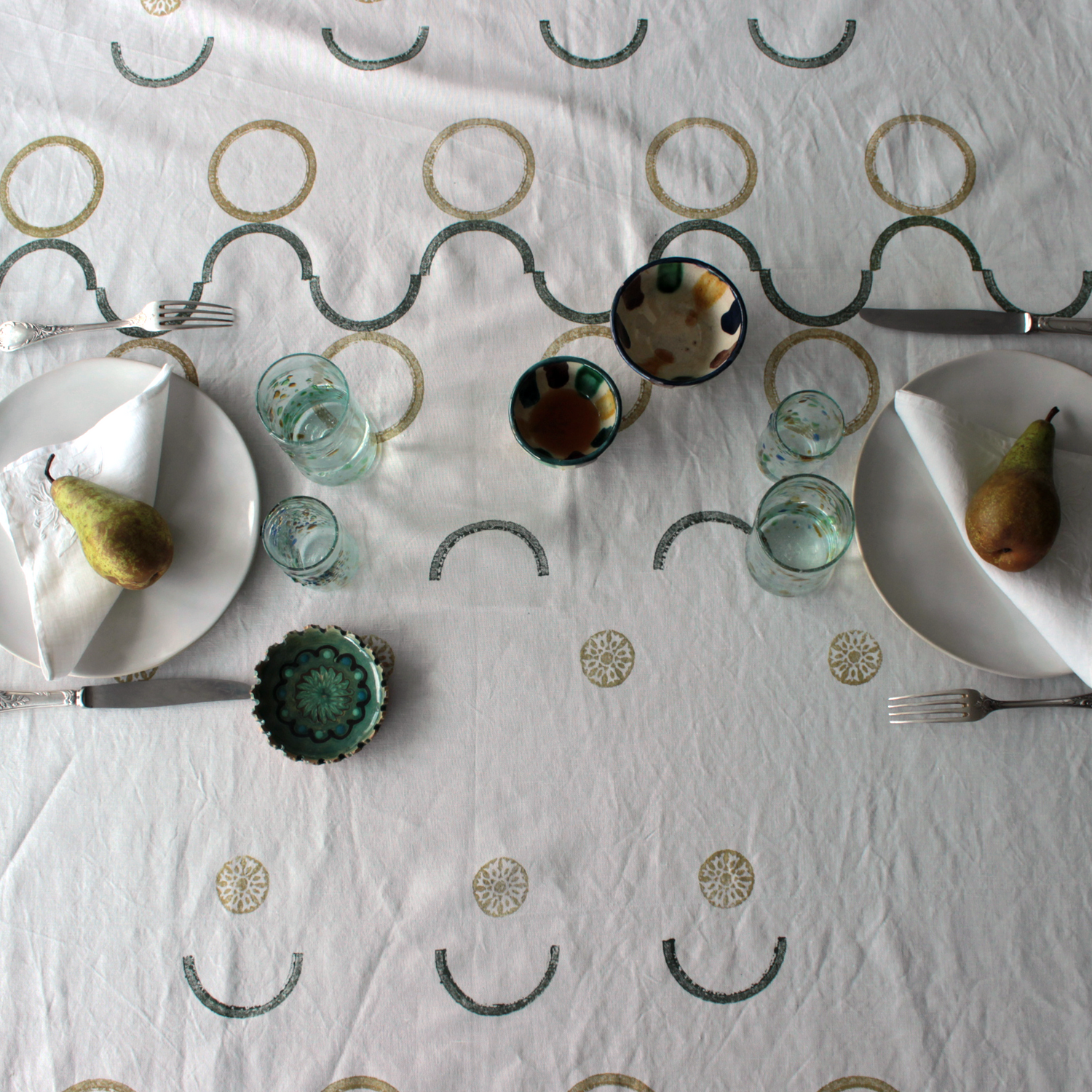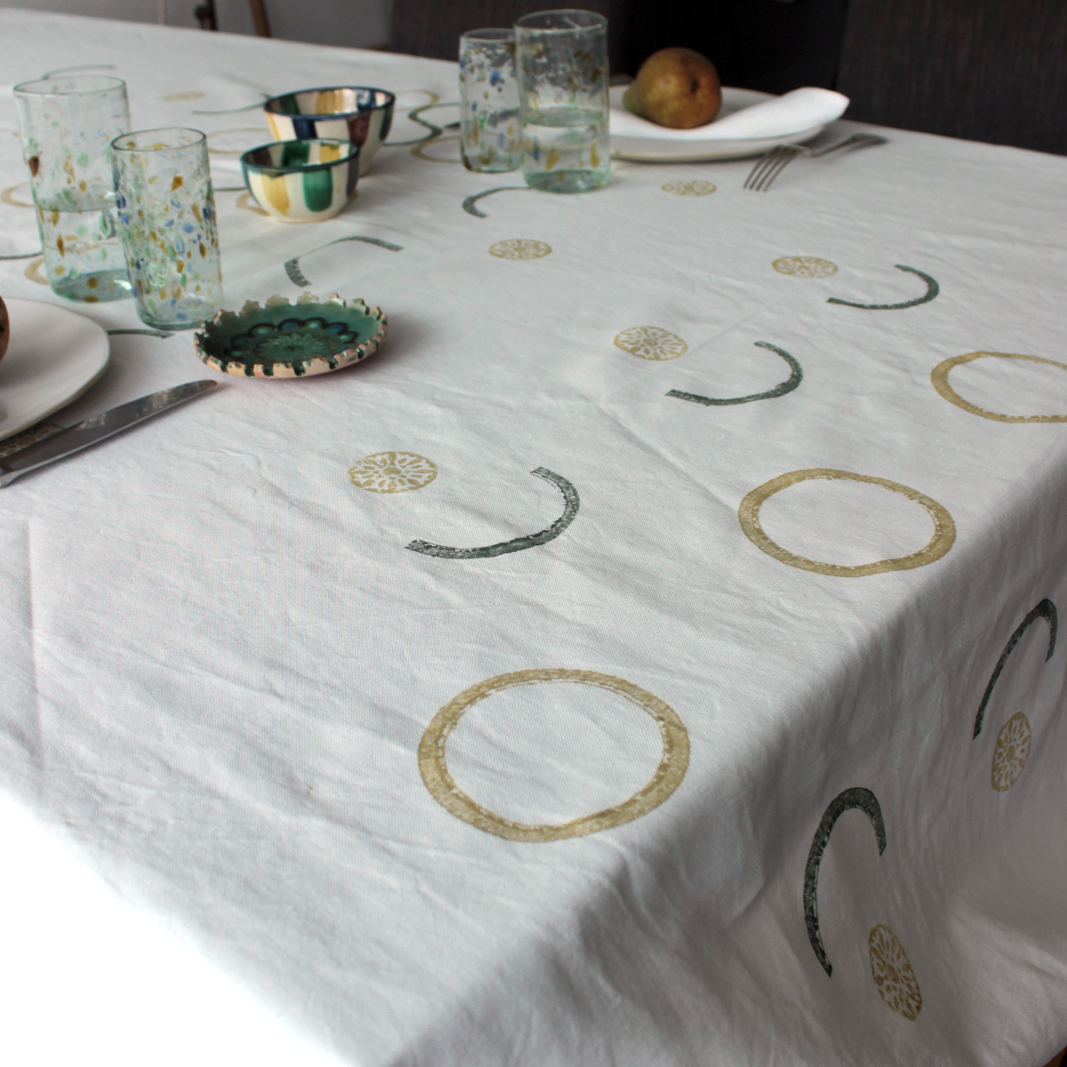 This tablecloth is printed with circles and half circles in soft tones of olive green and ochre. This clean and minimalist tablecloth is a beautiful addition to any table setting and tells a story of heritage and crafts. It is also eco-friendly, as all linens are made from European fabric deadstock.