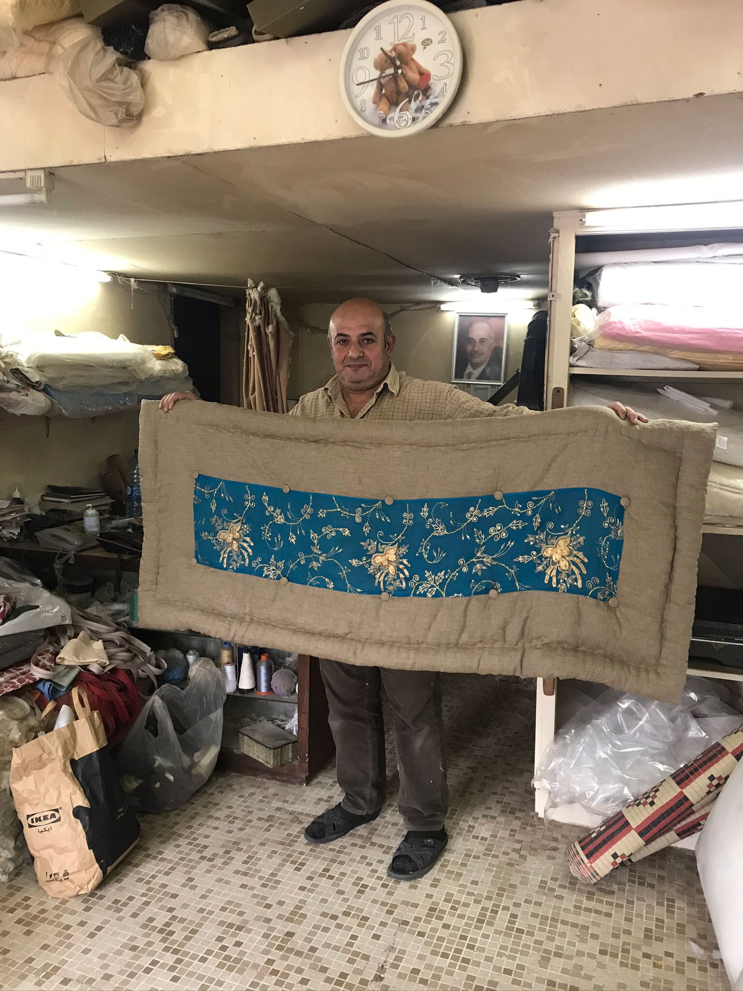 Add a touch of elegance with this unique quilted bedspread! Handcrafted in one tiny workshop in Lebanon, the mattress is upholstered in the old-fashioned style and is filled with kapok, a natural filling material. The gorgeous turquoise silk crêpe is part of a private fabric collection from India, featuring the immense talent of the Zardozi embroiderers.