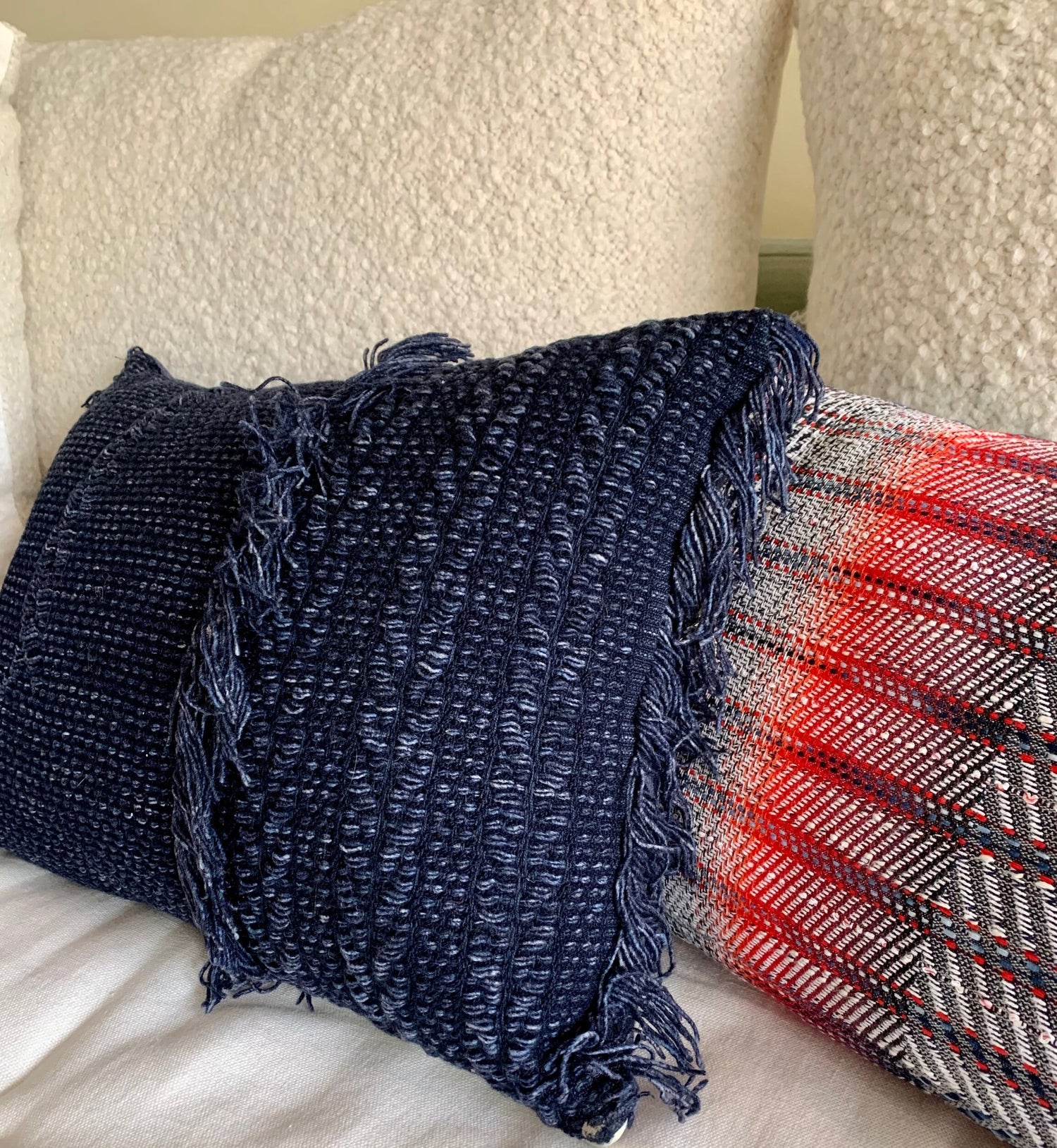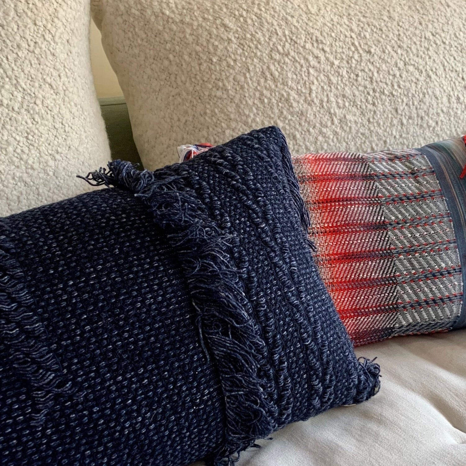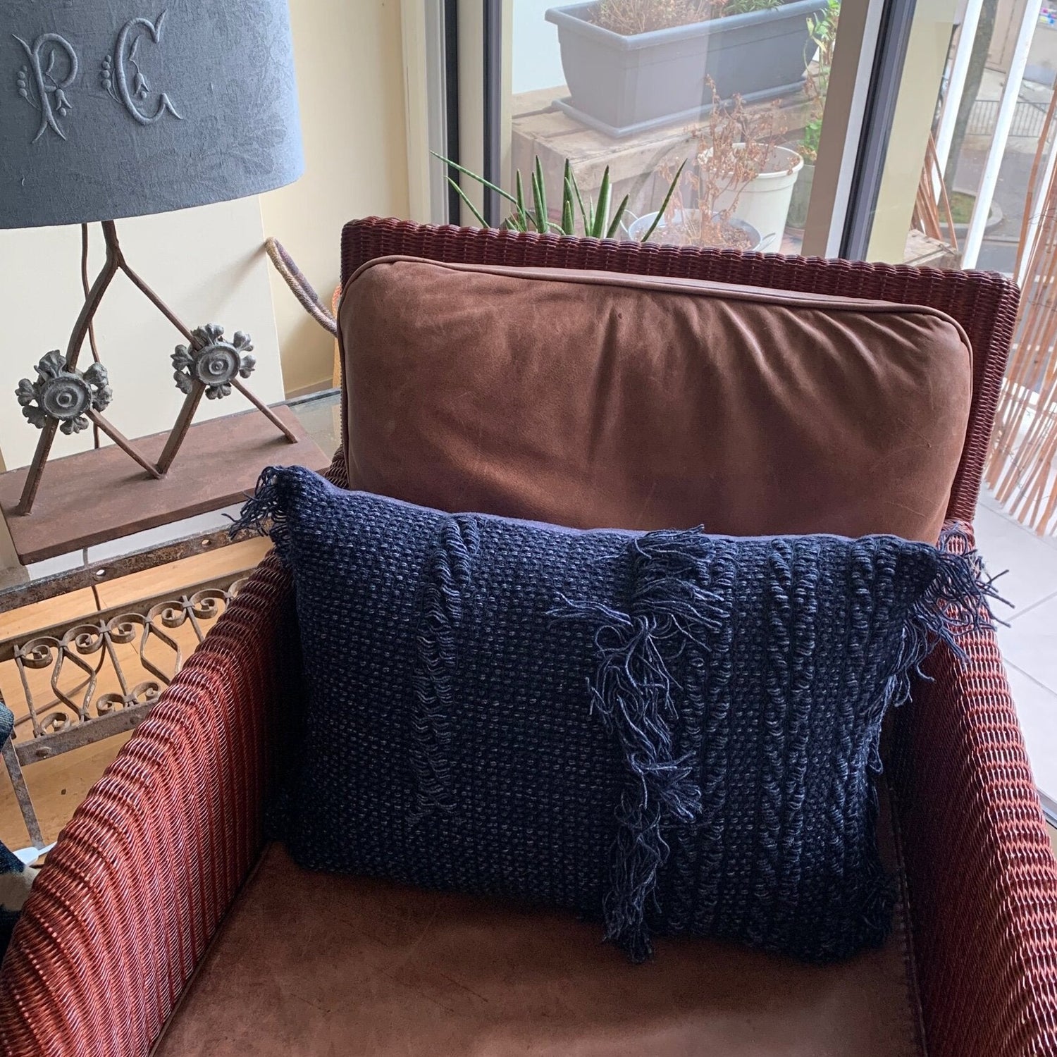 A classic addition to your sofa with this luxury decorative pillow in navy blue, made out of haute couture fabric remnants. We left the fringes to break up the formal look of the pillow, and we lined it with a beautiful blue grey wool flannel.