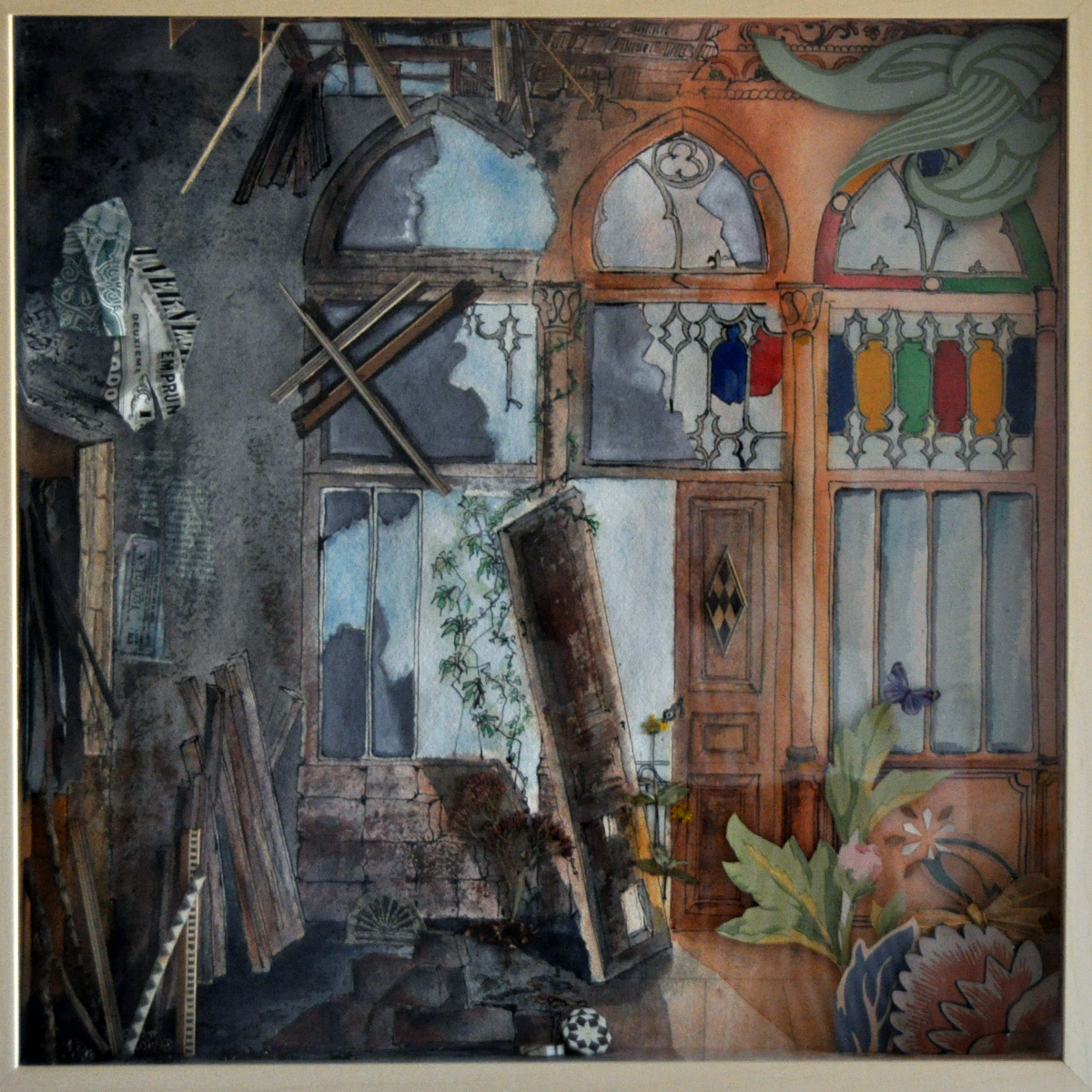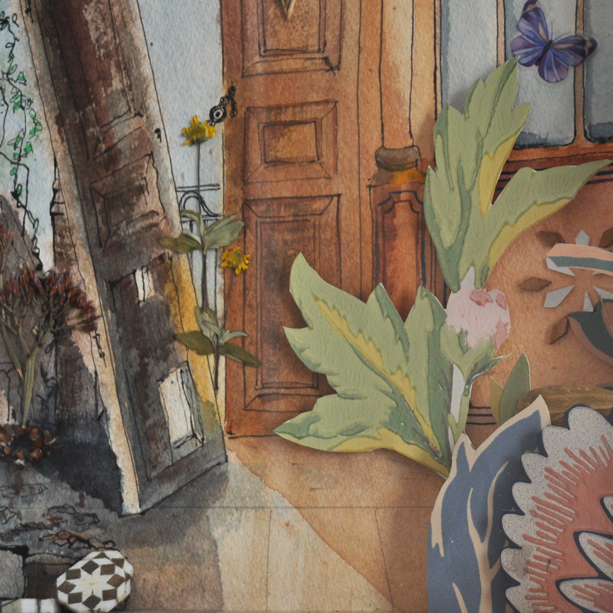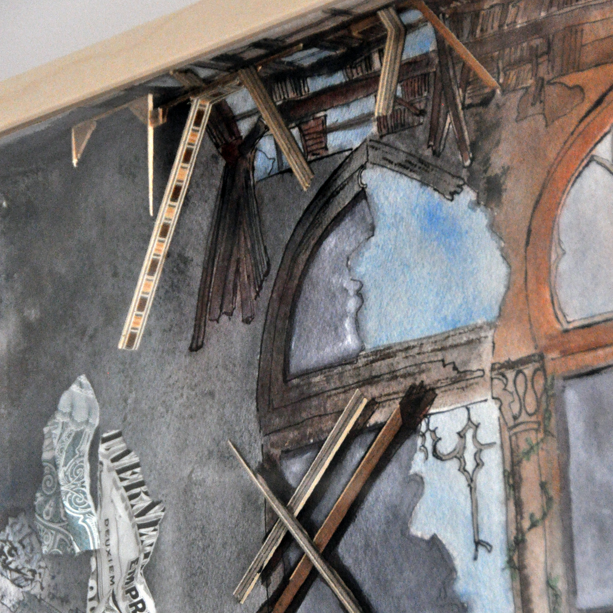 I wanted to treat this watercolor in three dimensions, adding even more depth and realism to the architecture. On the left, marquetry elements symbolize a decaying ceiling, with crumpled paper and blackened walls. In the center, things begin to soften. On the right, floral scrolls highlight painted decor in gentle shades of pink.