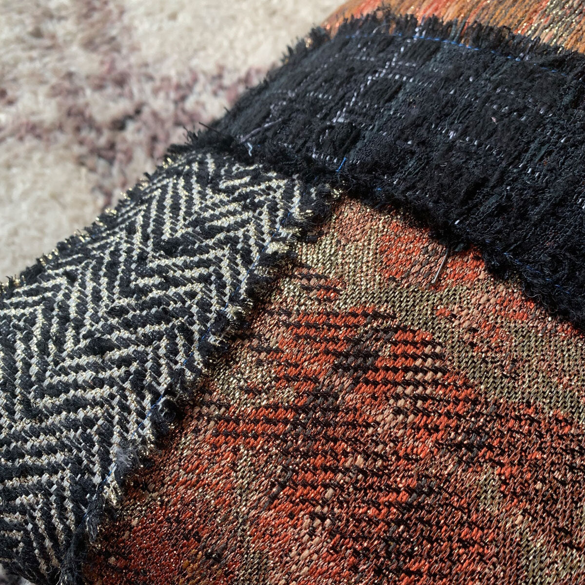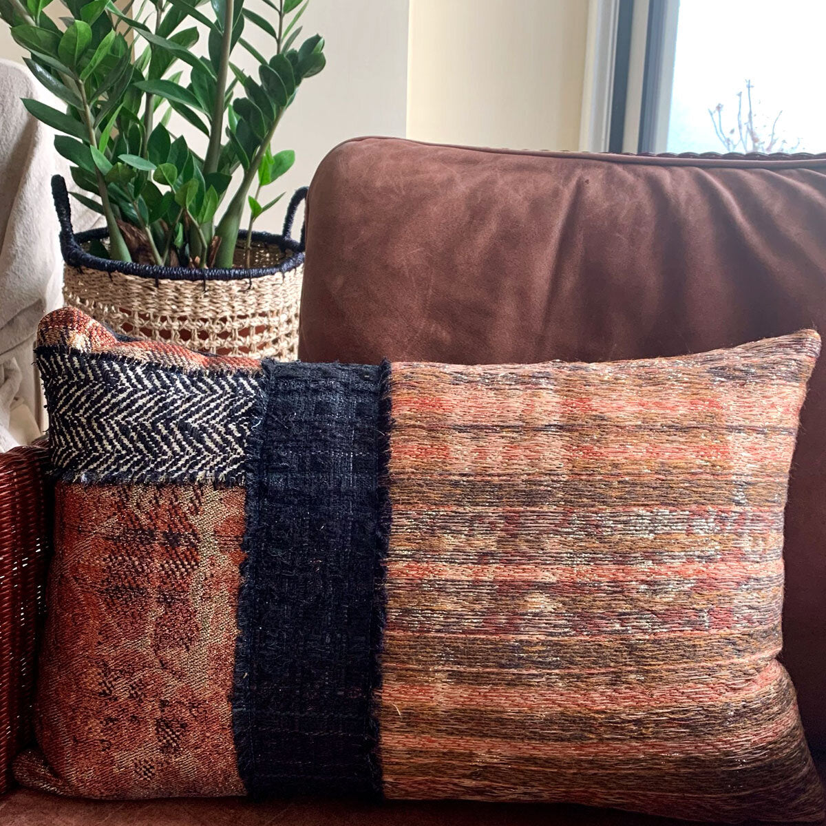 We matched different pieces of fabric remnants and created this unique ethical throw pillow in warm hues of copper, brown and gold, accented by woven bands in black and white. Would be great on a brown leather sofa!