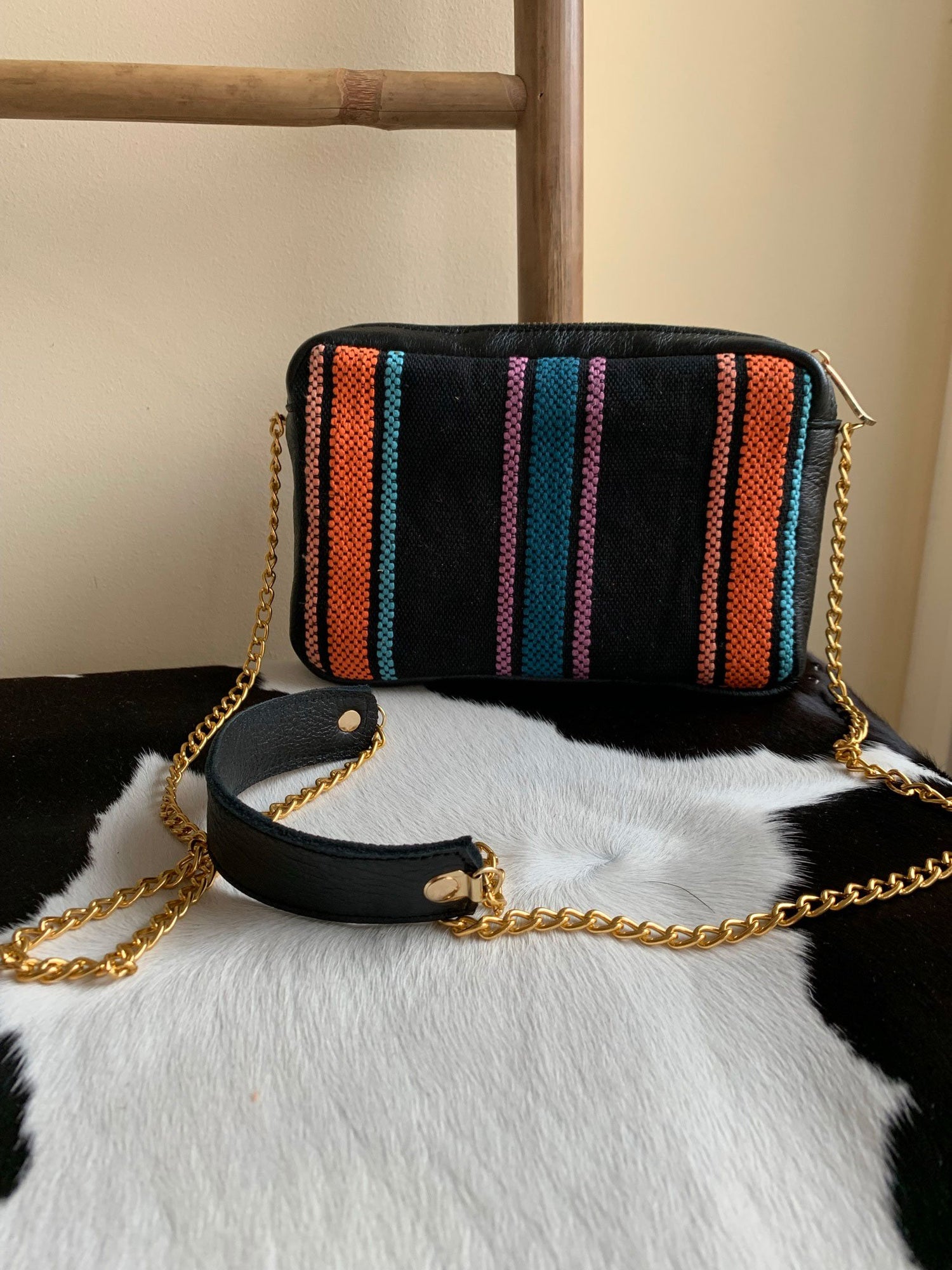 Elegant stripes in black, orange, violet and peacock blue for a versatile purse which will be your best friend from mornings to evenings. Light and pleasant to wear, this unique shoulder chain bag will easily become a favorite season after season.