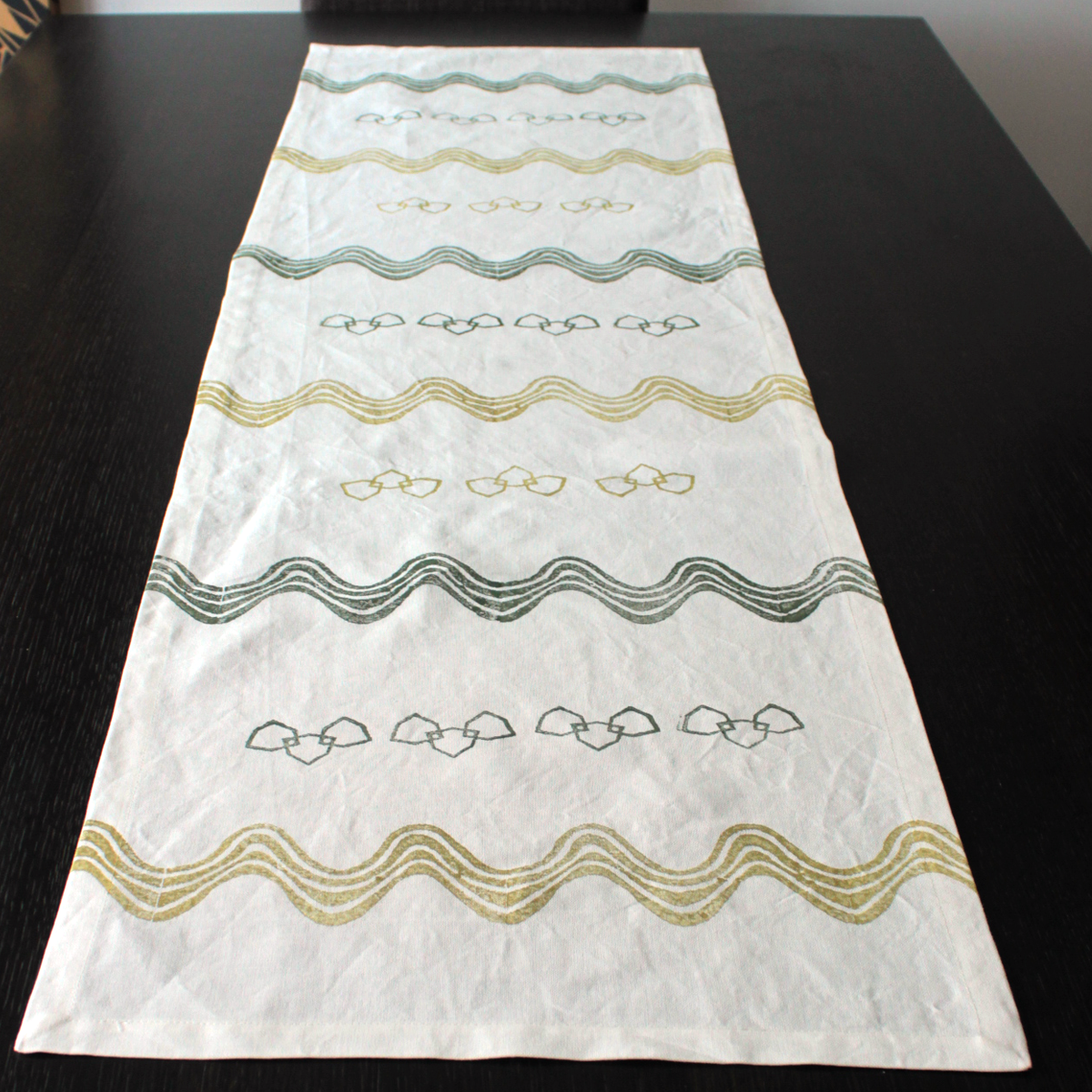 Introducing our newest addition to our online product range - a simple yet elegant runner from our new capsule collection. Handcrafted with care in Lebanon using the block printing method, this runner is the perfect decoration for any console or dining table. Our design team has carefully chosen patterns of repetitive waves in olive green, alternating with tiny geometric symbols printed in ochre, creating a beautiful and unique look.